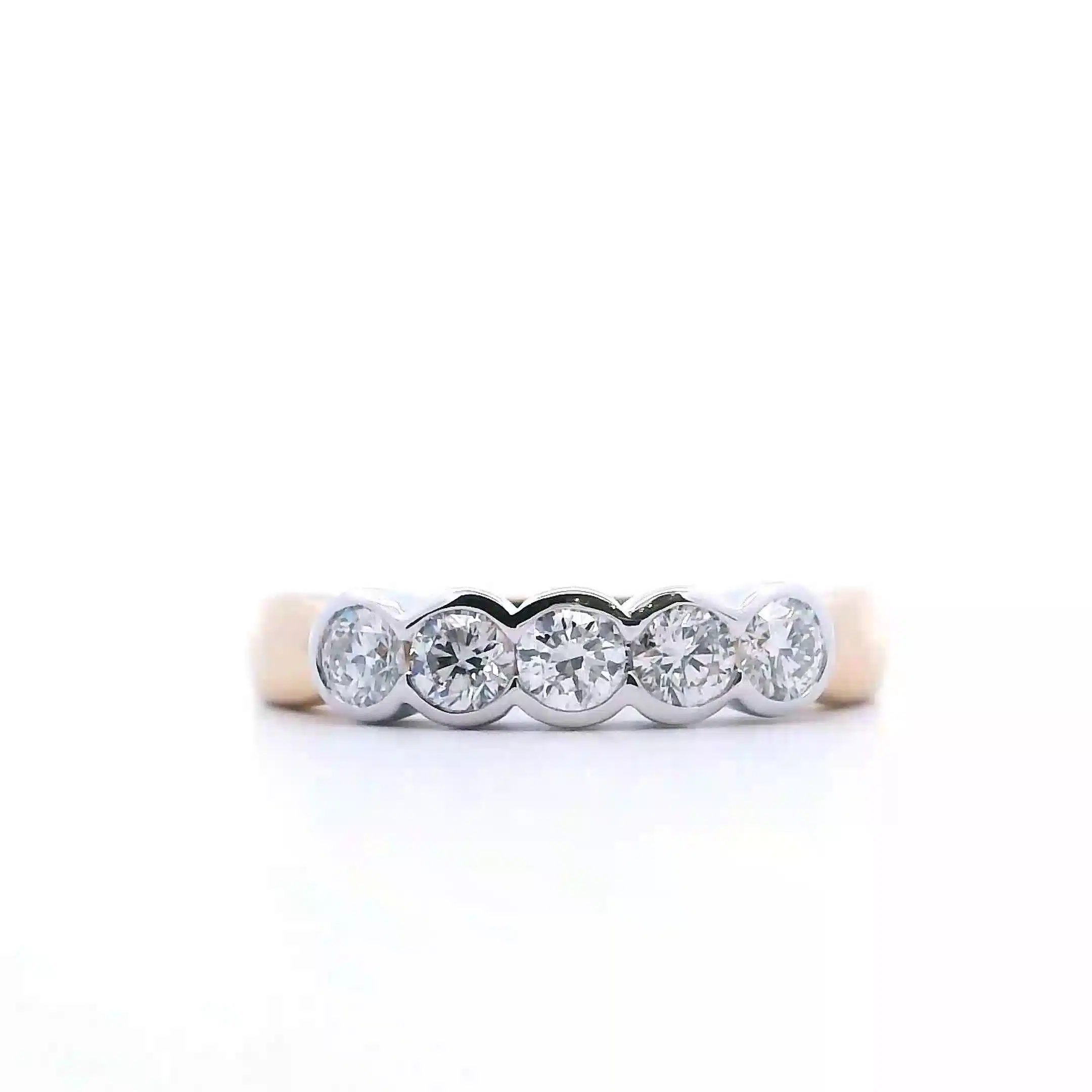 Crafted in luxurious 18ct two-tone gold, this exquisite five-stone diamond ring features a row of brilliant-cut diamonds, each set in a secure rubover setting to maximise their sparkle.