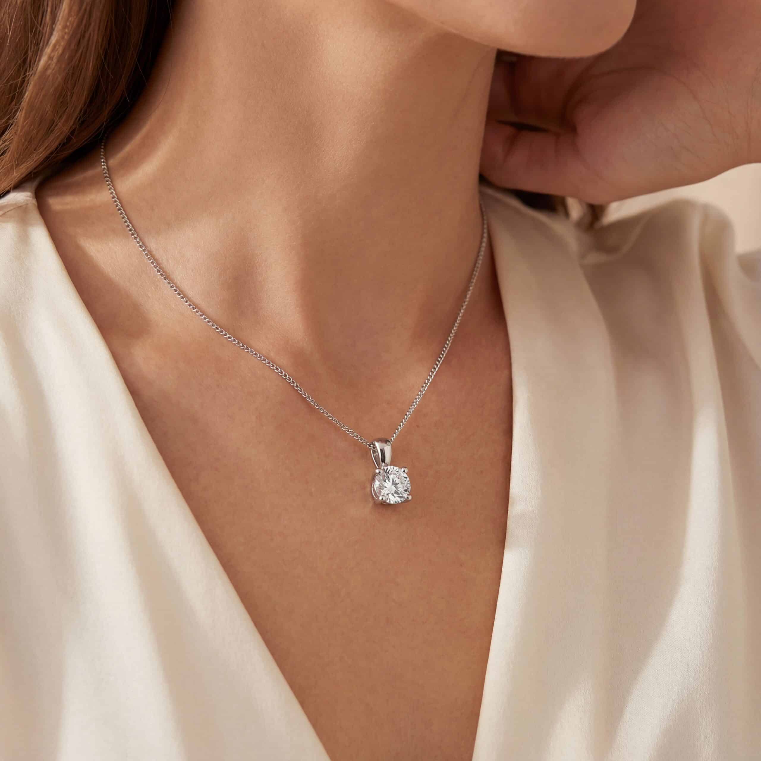 Set in a classic four-claw platinum mount, the pendant allows maximum light return while maintaining a clean, sophisticated look. The piece is presented on a 9ct white gold chain, measuring 18 inches with an additional 16-inch fitting, offering versatility for everyday wear or special occasions.