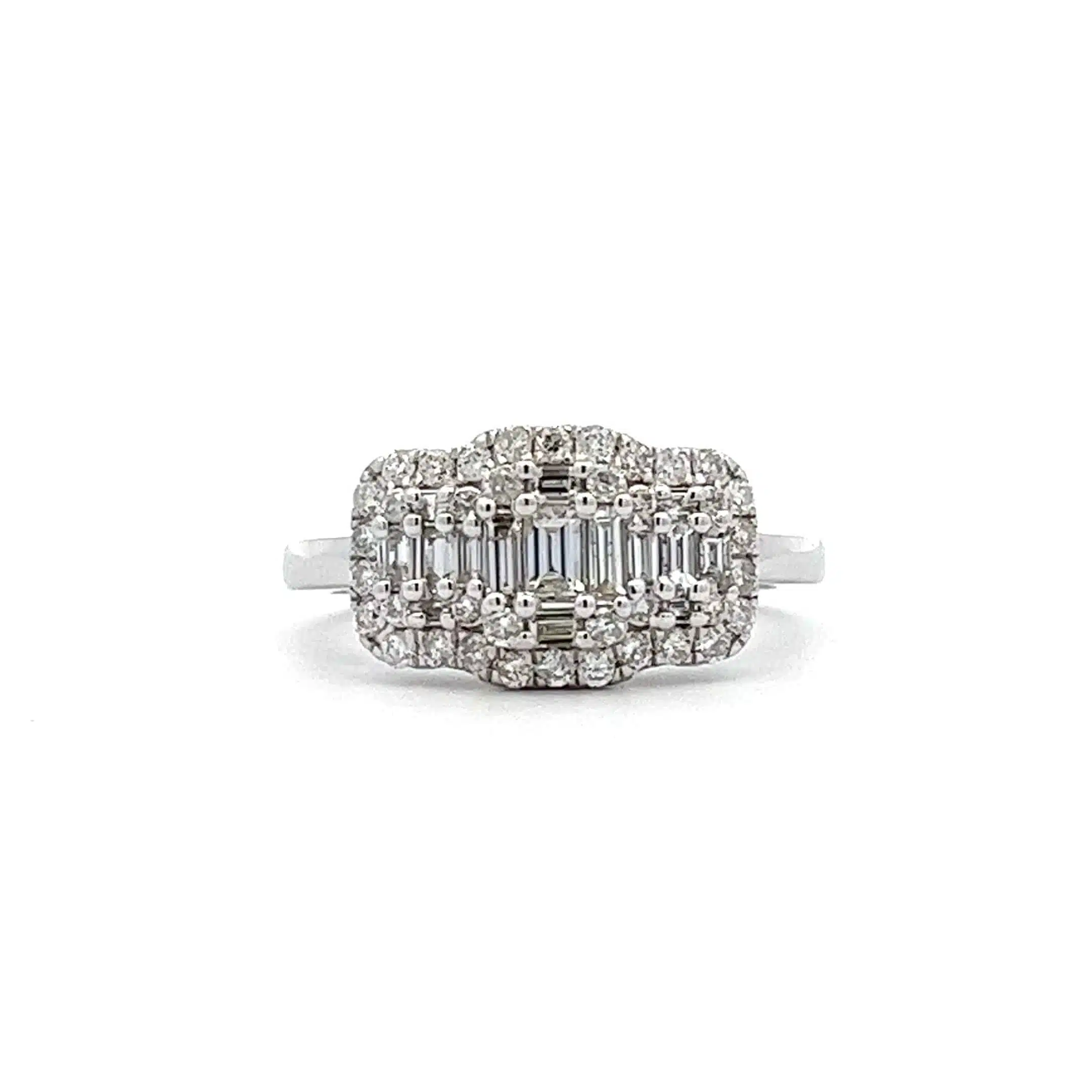 Combing baguette cut and brilliant cut diamonds this triple halo design cluster ring has been designed as either a dress ring or engagement ring.
