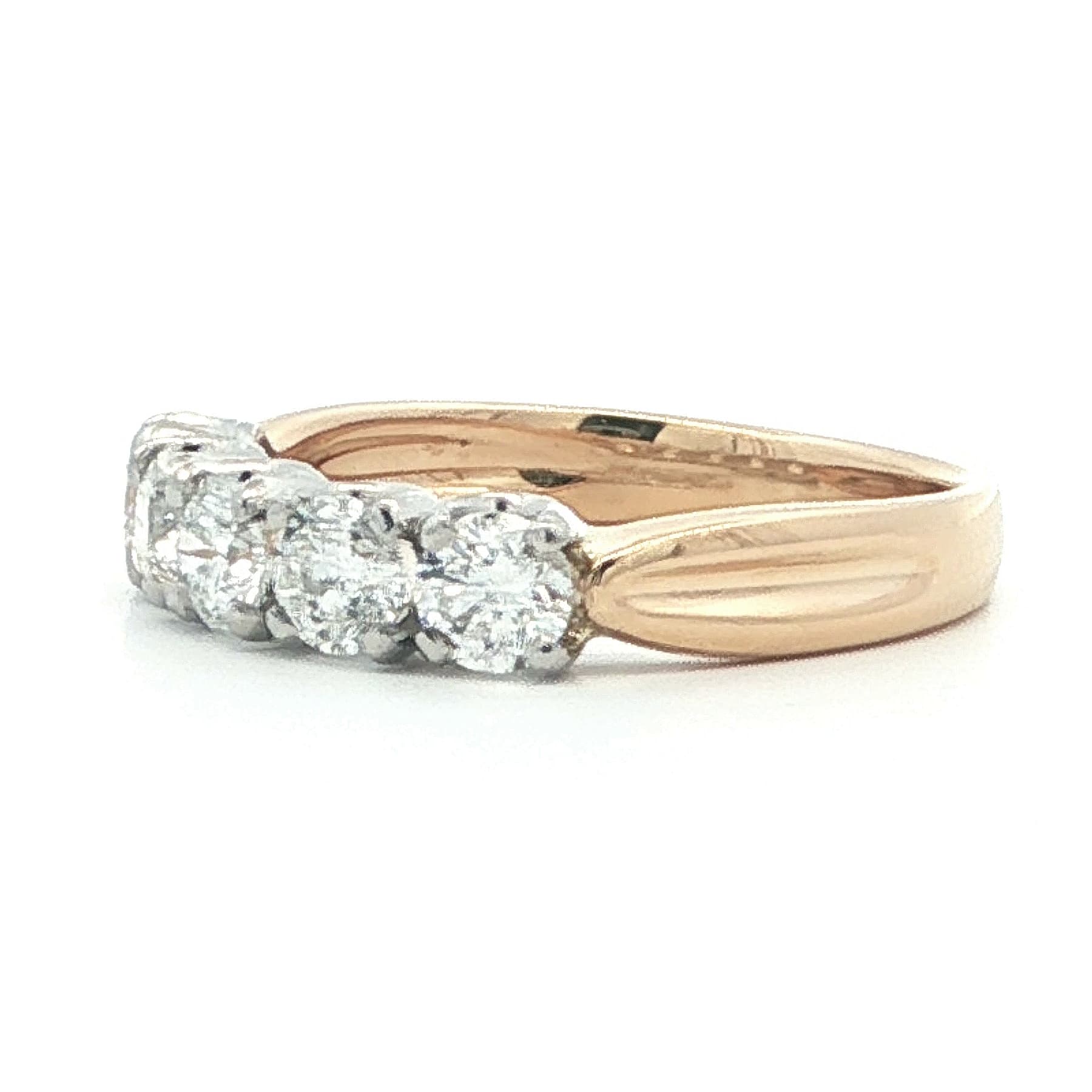 This elegant five stone diamond ring features a row of brilliant cut diamonds set in platinum four-claw settings, offering exceptional sparkle and definition. The diamonds are beautifully complemented by a warm yellow gold shank with distinctive fluted shoulders, creating a refined contrast between precious metals. A timeless design, ideal as an anniversary ring, eternity-style band, or statement piece.