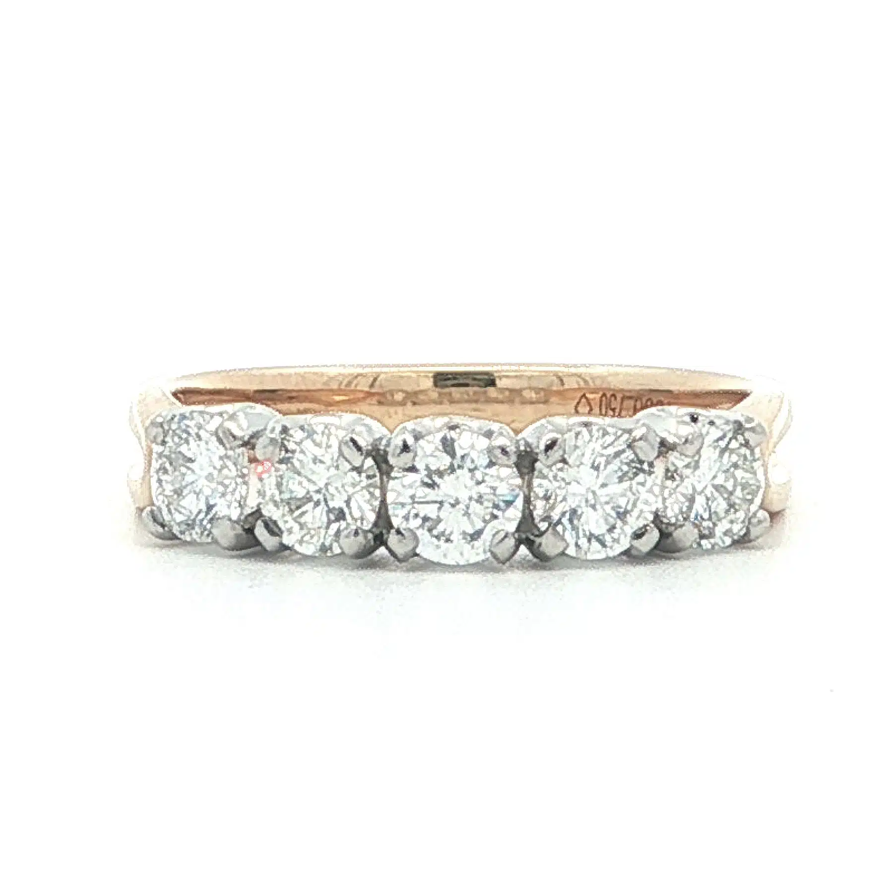 This elegant five stone diamond ring features a row of brilliant cut diamonds set in platinum four-claw settings, offering exceptional sparkle and definition. The diamonds are beautifully complemented by a warm yellow gold shank with distinctive fluted shoulders, creating a refined contrast between precious metals. A timeless design, ideal as an anniversary ring, eternity-style band, or statement piece.