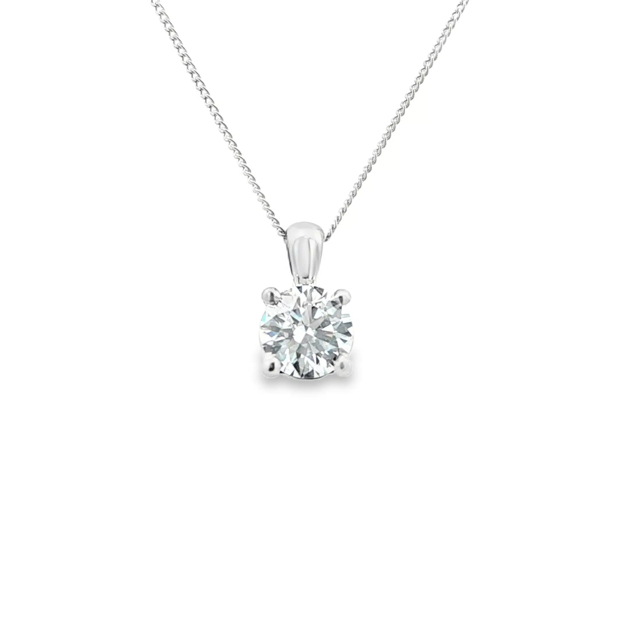 The diamond is set in a timeless four-claw platinum mount, crafted to allow maximum light performance while maintaining elegant proportions. This luxurious pendant is paired with a 9ct white gold chain, measuring 18 inches with an additional 16-inch fitting, making it ideal for everyday wear or special occasions.