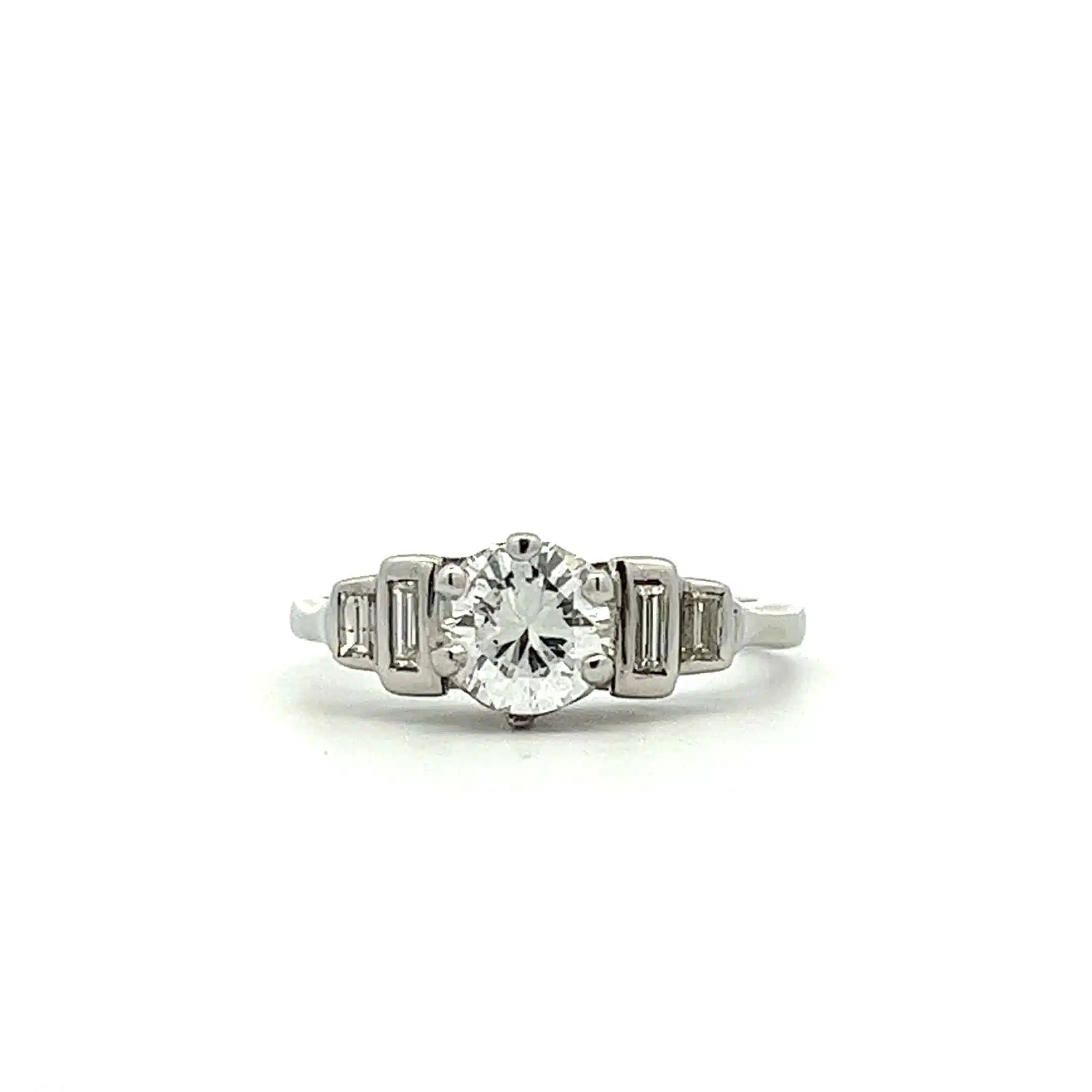 This stylish pre-owned diamond solitaire ring is set with a central brilliant cut diamond assessed as 1.10ct and finished with a pair of baguette cut diamonds to either side.