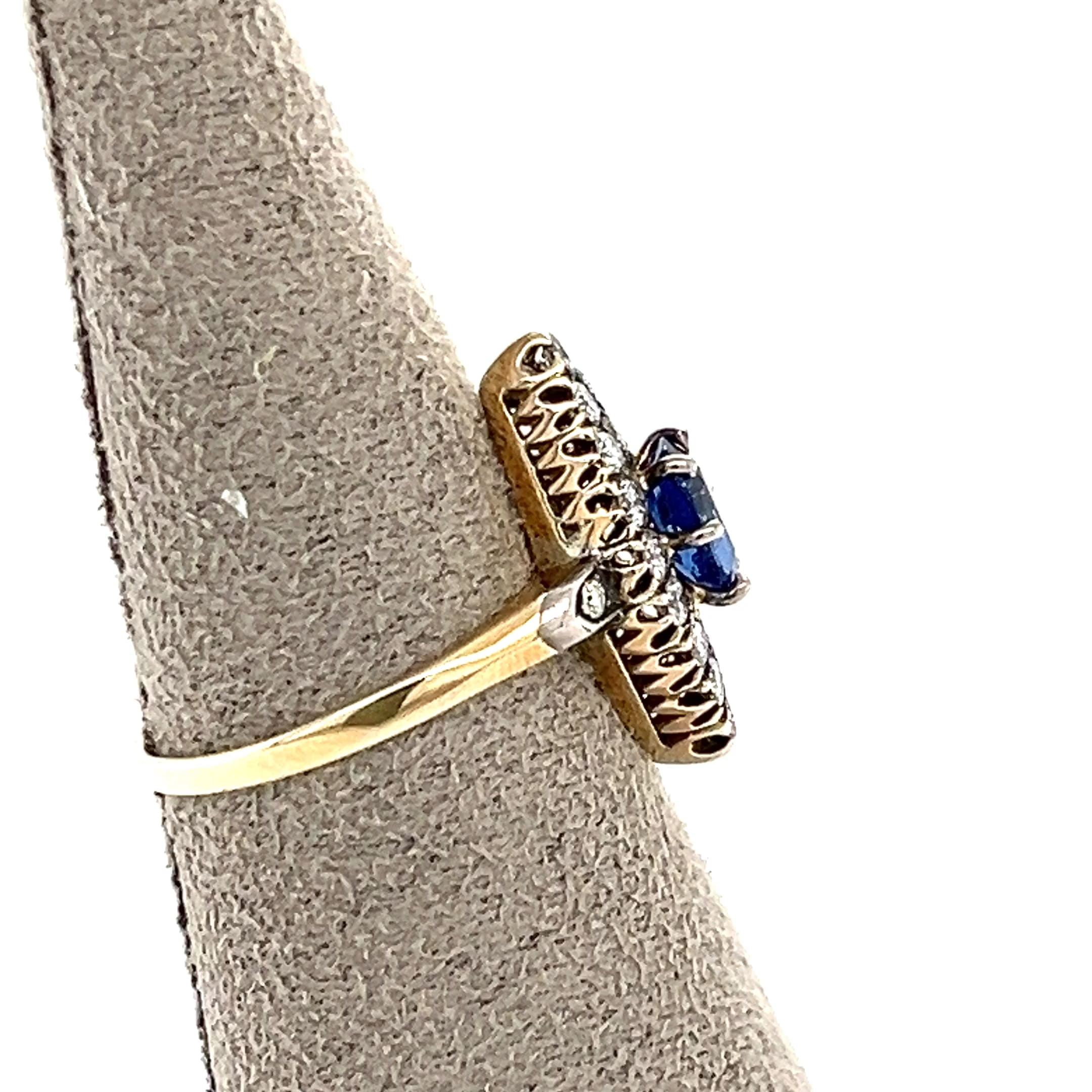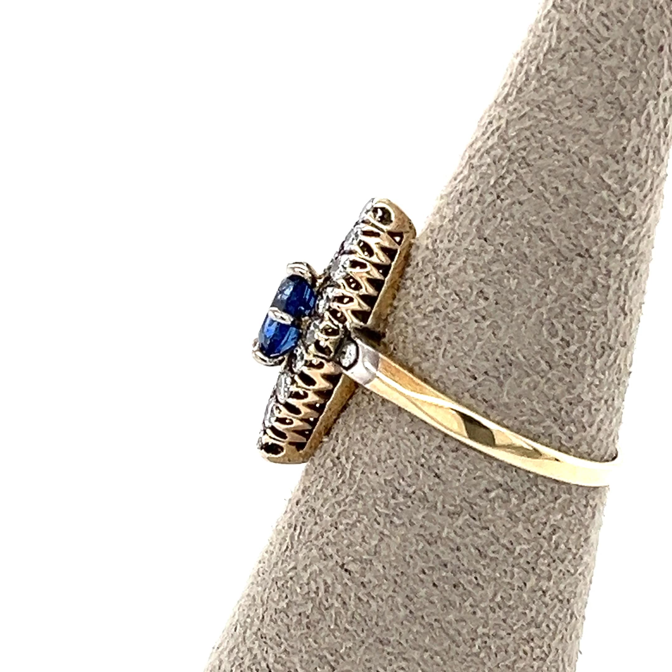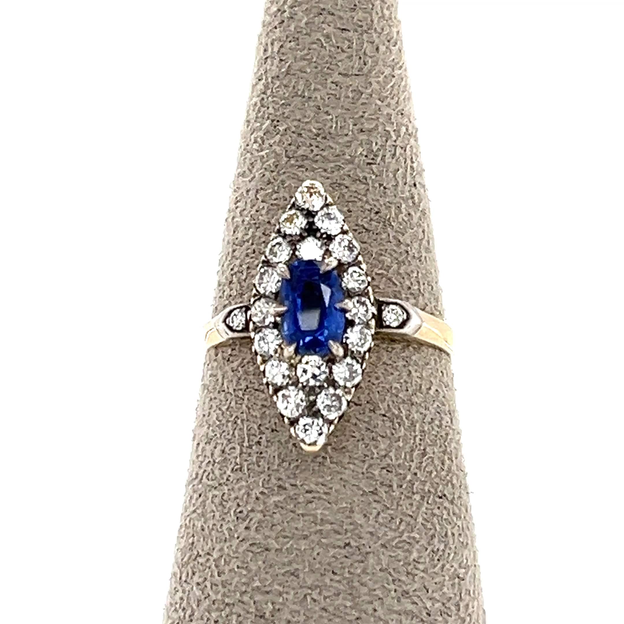Discover elegance with this stunning 14ct two-tone gold marquise style sapphire cluster ring. Adorned with an estimated 0.50ct sapphire and sparkling diamonds, this pre-loved treasure is perfect for any occasion. Its unique design and vibrant colours make it a must-have addition to your jewellery collection.