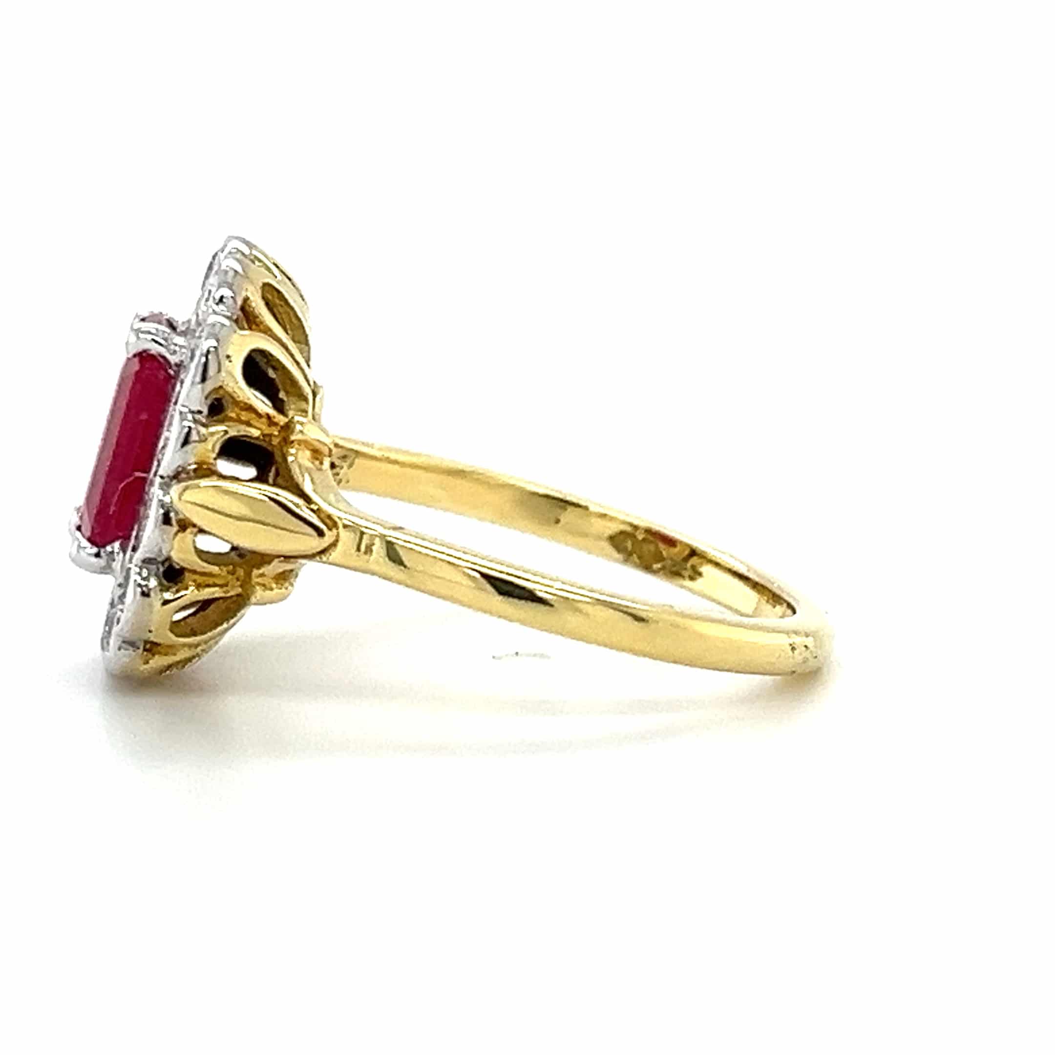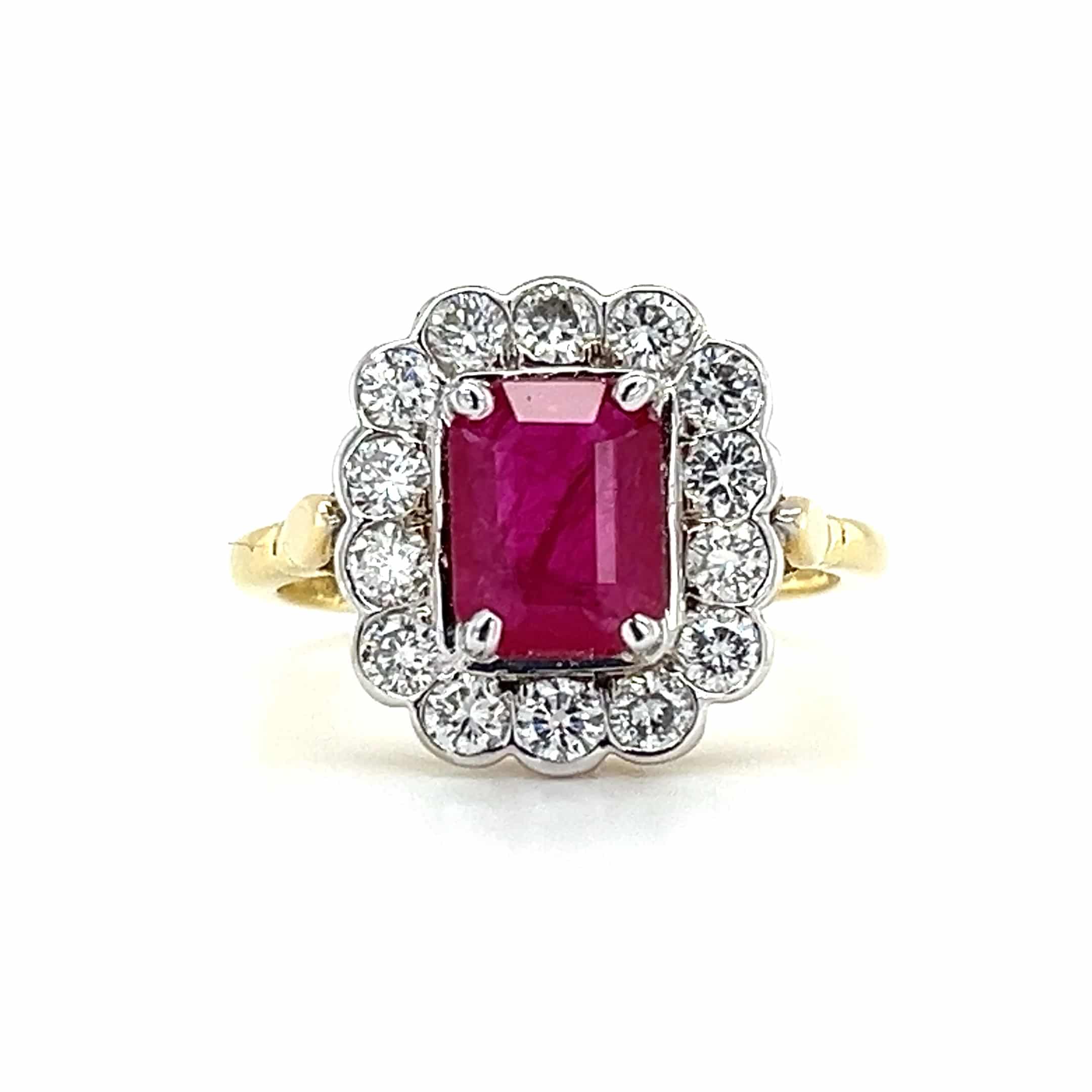 Celebrate love with this exquisite 18ct Gold Ruby and Diamond Cluster Ring. Featuring a stunning 1.59ct ruby surrounded by sparkling diamonds, this pre-loved piece is perfect for marking a ruby anniversary. Its unique blend of white and yellow gold adds a touch of elegance, making it a cherished addition to any jewellery collection.