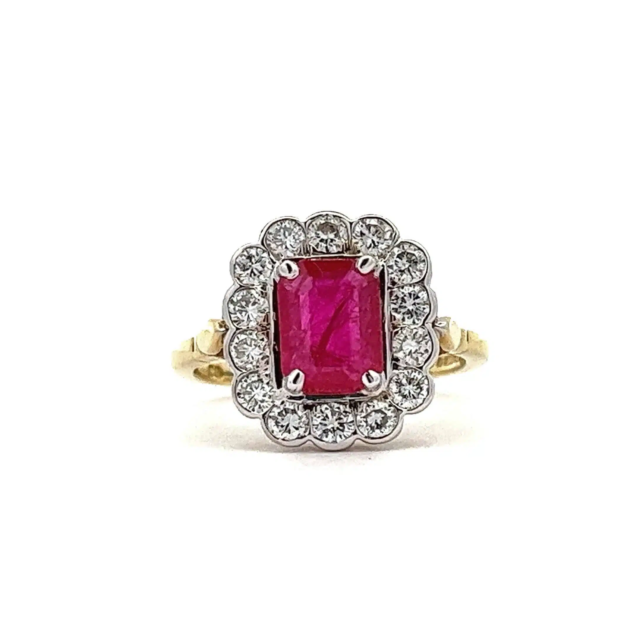 This striking pre-owned ring has been set with a central emerald cut Ruby in a white gold four claw setting and finished with a surround of 14 grain and thread set brilliant cut Diamonds.
