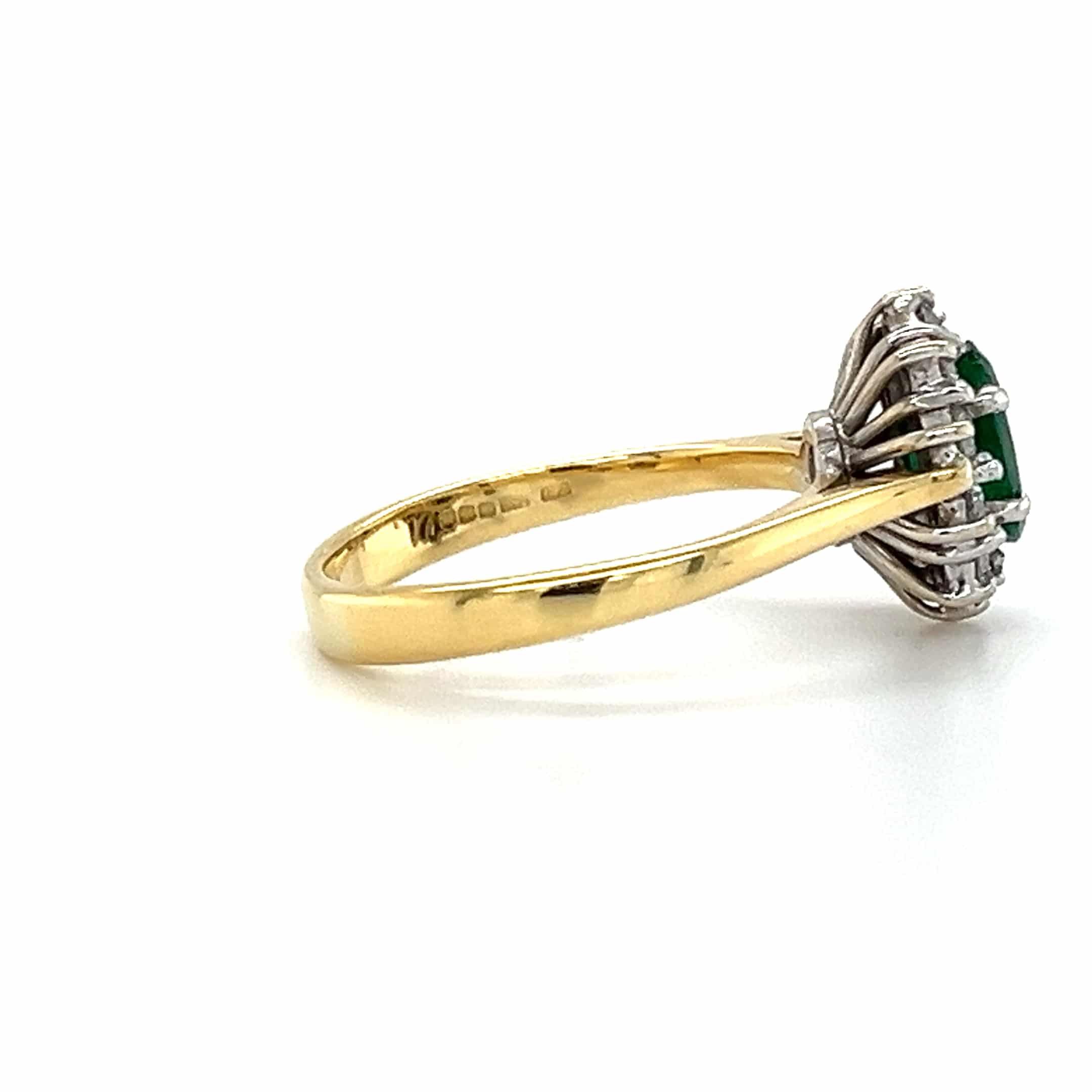 Discover elegance with this stunning 18ct two colour emerald and diamond cluster ring. Set in a blend of white and yellow gold, it features an enchanting emerald of approximately 0.65ct surrounded by sparkling diamonds totalling around 0.40ct. A pre-loved treasure, it’s the perfect gift for anniversaries or special occasions.
