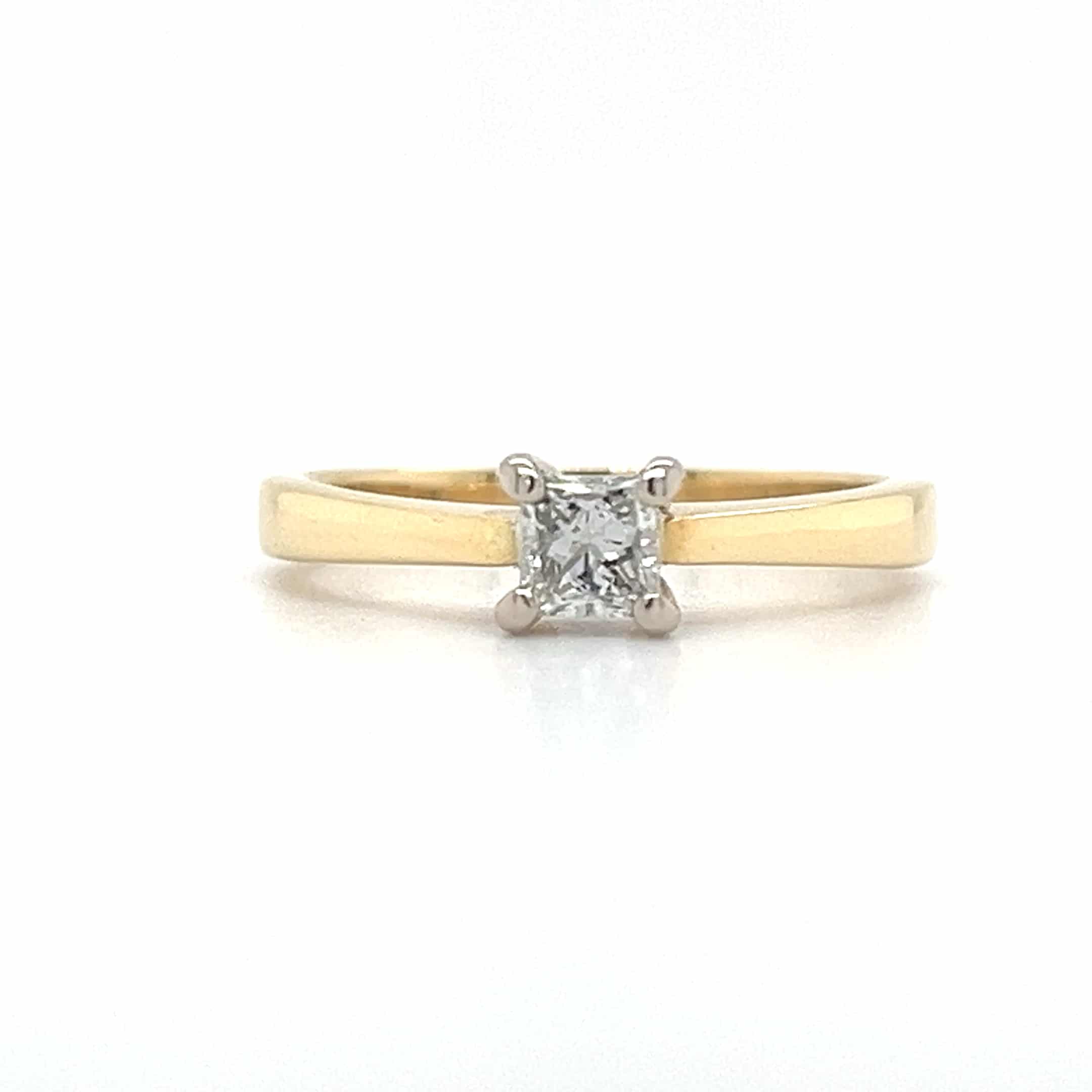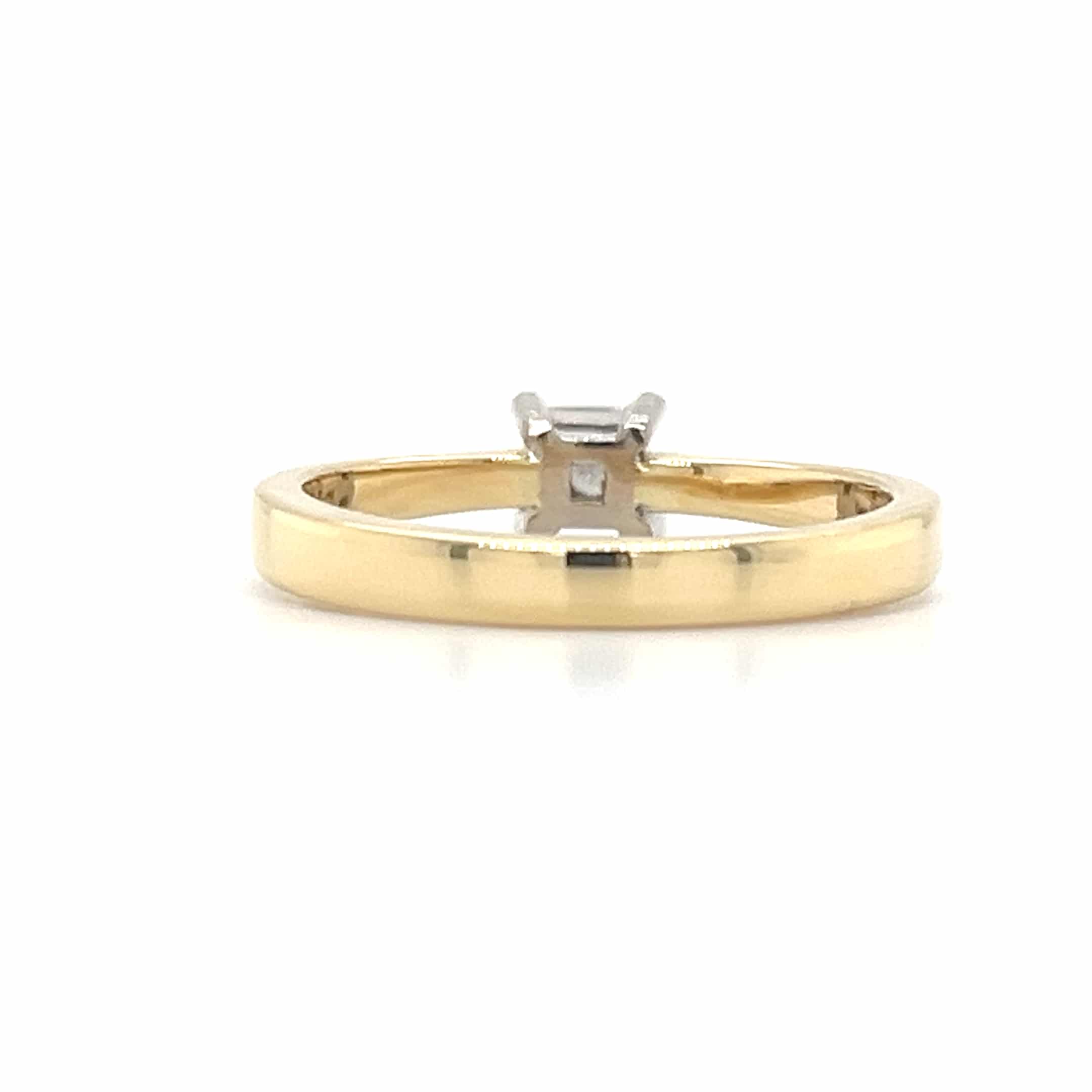 The two-tone design pairs a warm yellow gold band with a bright white gold head, enhancing the diamond’s brilliance and giving the ring a crisp, contemporary finish. With its balanced proportions and understated profile, it sits beautifully alone or stacked alongside a wedding band.