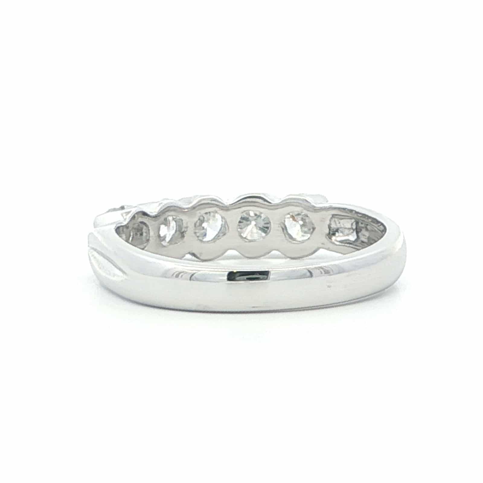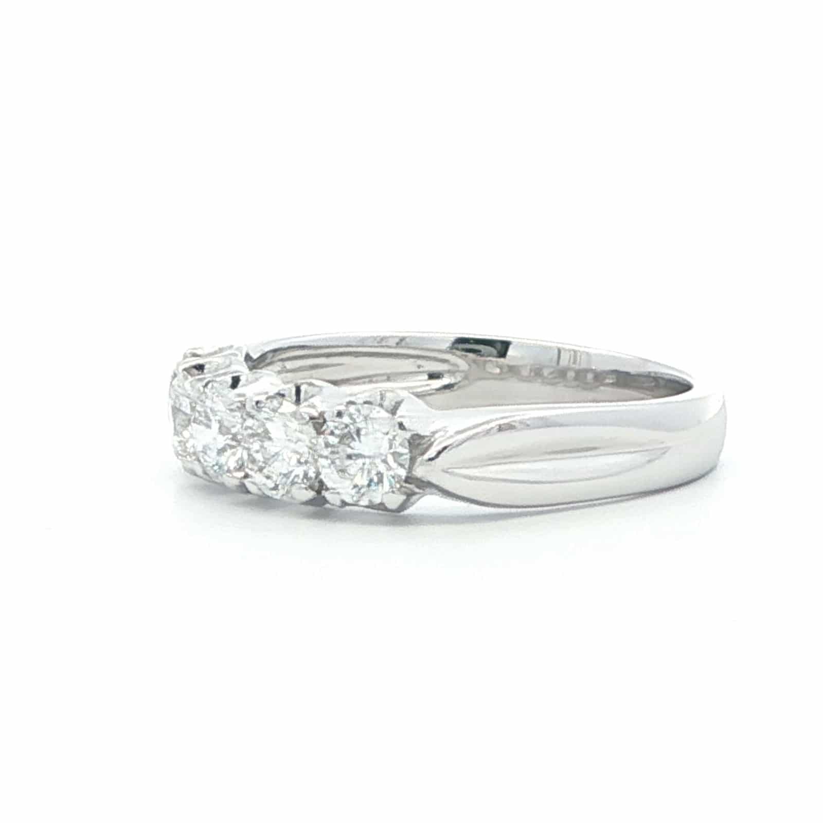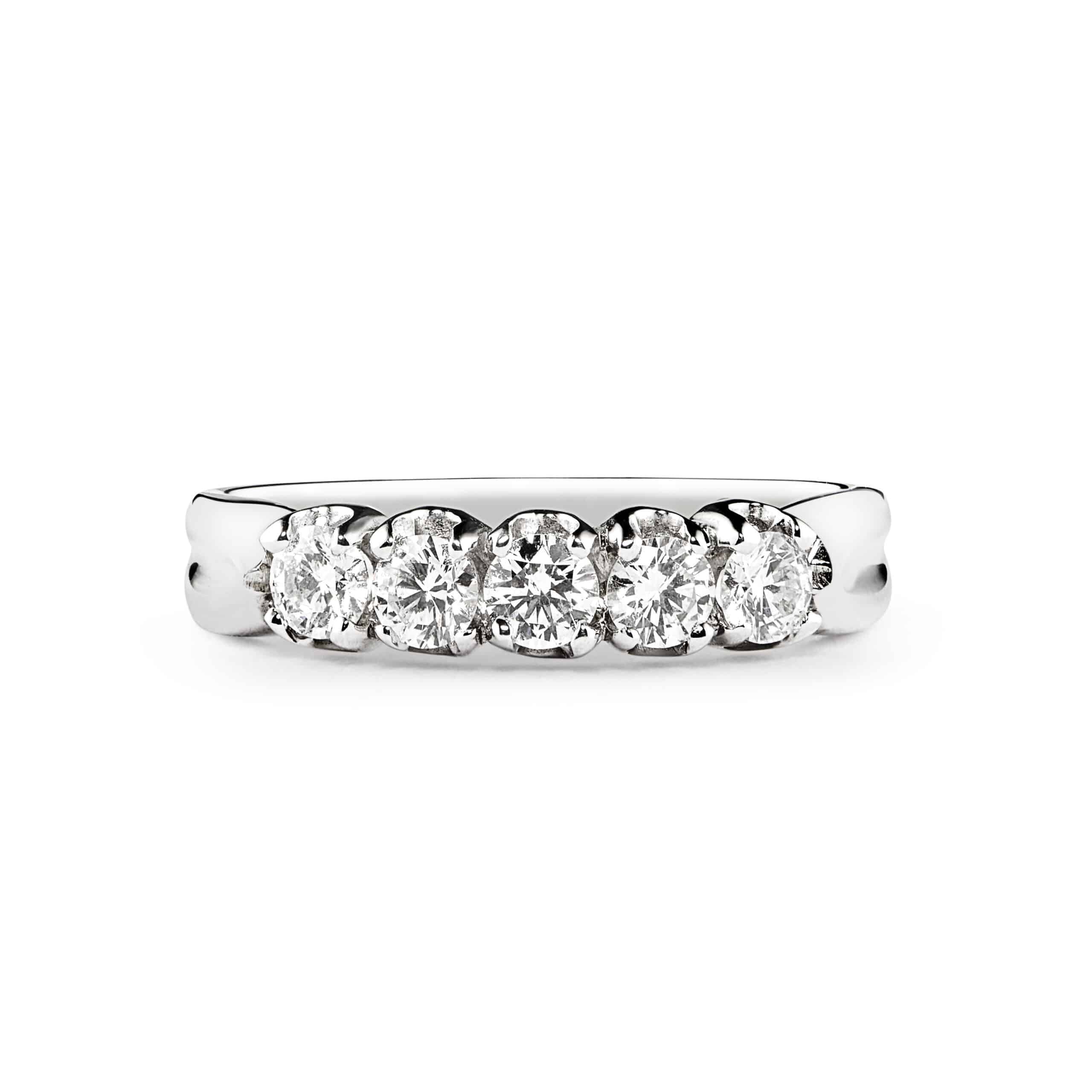 This exceptional five-stone diamond ring is crafted in 18ct white gold and showcases 0.85ct of lab grown brilliant cut diamonds. Each stone is individually selected in D/E colour and VS clarity for a perfectly matched, beautifully bright finish. The signature flute-design shoulders add subtle detailing while keeping the focus on the clean line of diamonds. Refined, contemporary, and ideal for marking a milestone or adding a luxurious statement to your collection.