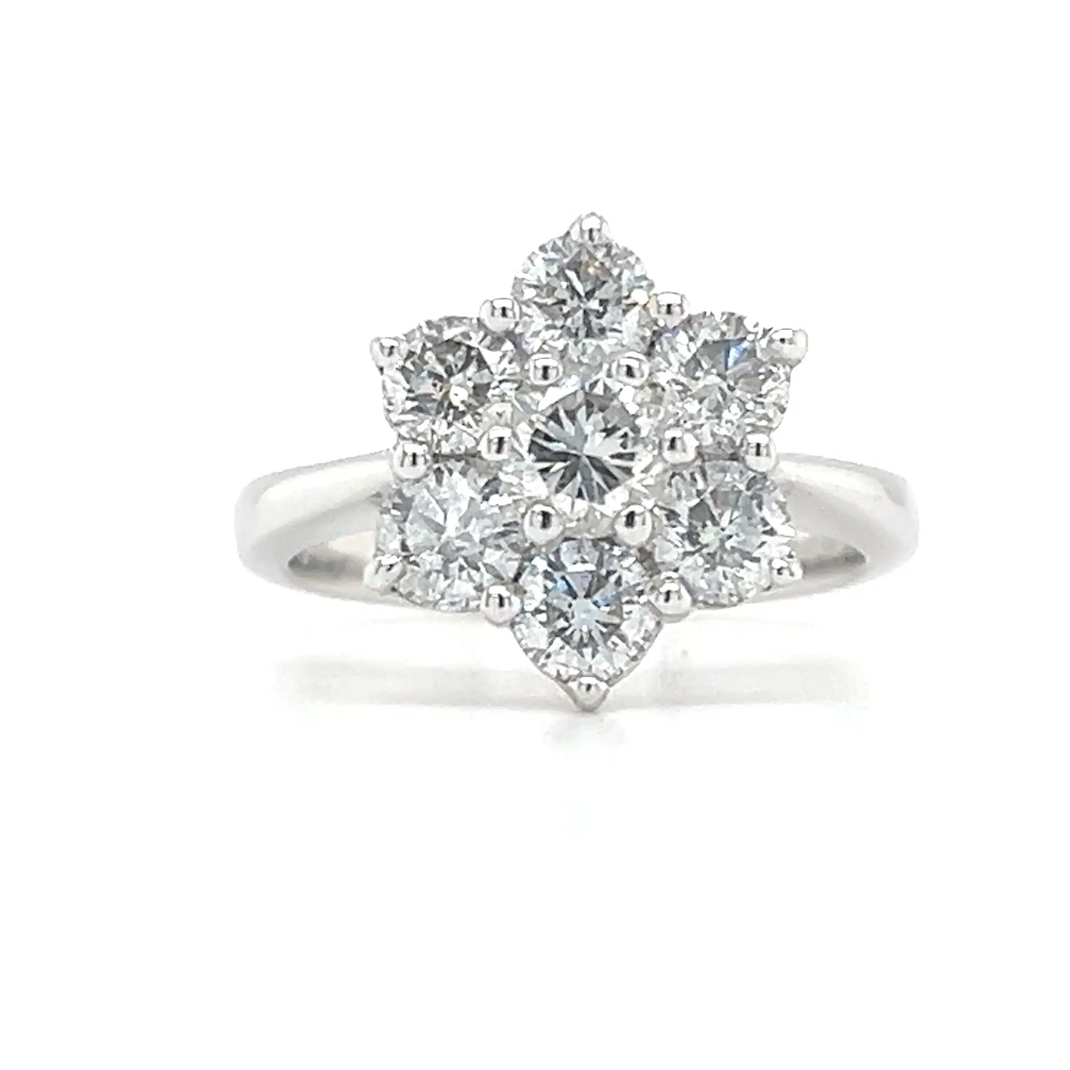 This beautifully balanced cluster ring showcases the enduring appeal of white gold and natural diamonds, offering both luxury and value. The elevated cluster setting enhances light performance, while the refined white gold band provides a clean and sophisticated finish.