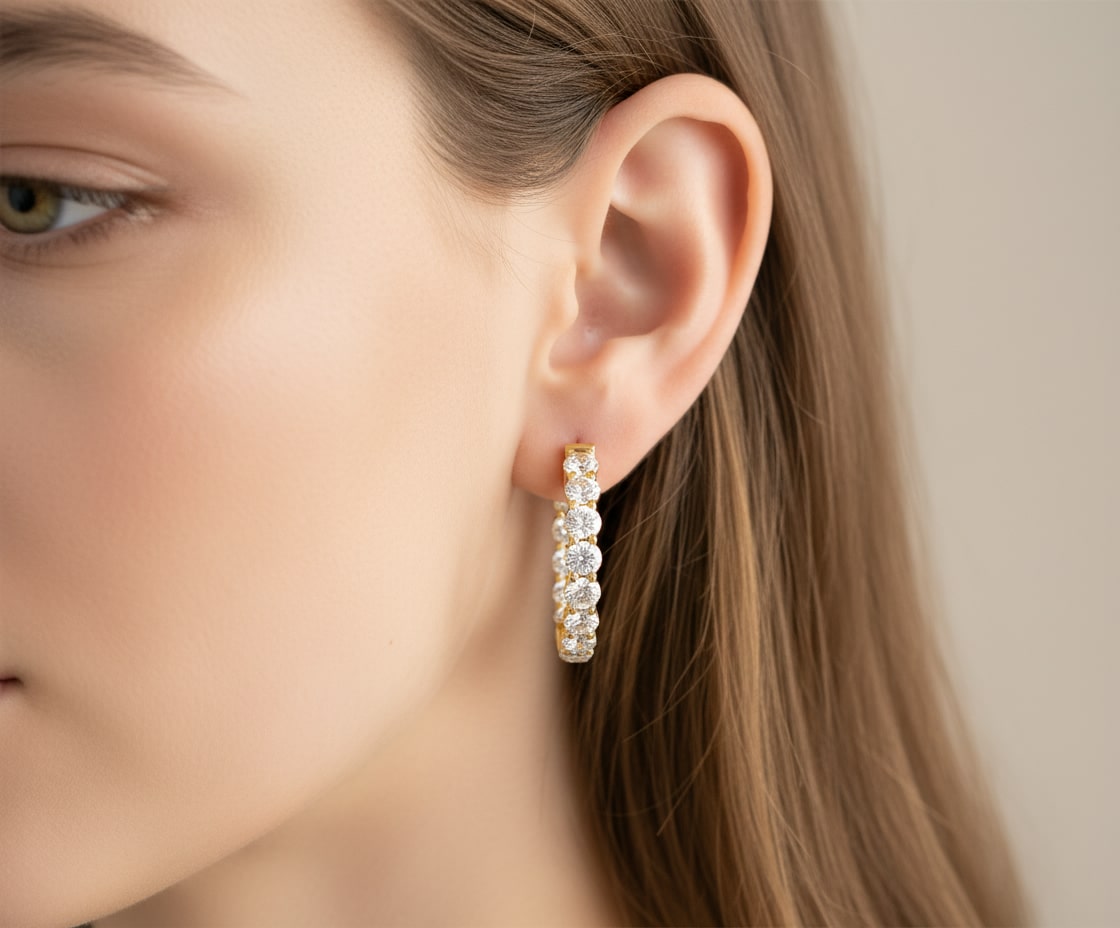 Crafted in warm high-polish yellow gold, the hoops feature an elegant open-work gallery that enhances the brightness and visibility of each stone. Secured with a post and push-down clasp, they are comfortable, secure, and designed for effortless everyday wear.