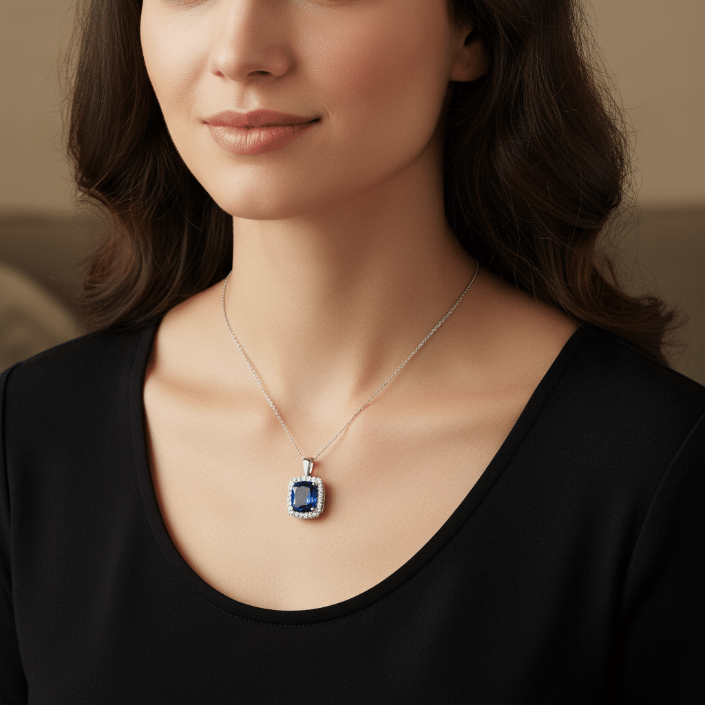 This exquisite pendant features a captivating 4.09 carat cushion-cut lab grown sapphire, radiating a deep and vibrant blue that captures light with every movement.
