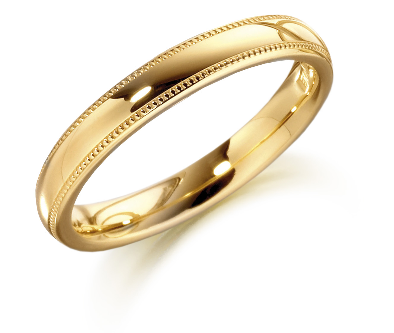 With mill-grained detailing this 9ct yellow gold wedding band is a medium weight domed court wedding ring.
