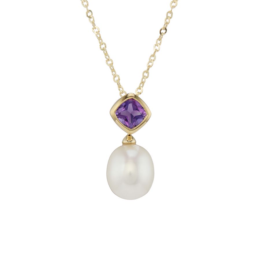 The 9ct yellow gold pendant showcases a luminous white pearl paired with a sparkling amethyst, its deep purple hue complemented by the warm shade of the gold. This piece is perfect for special occasions and will elevate your everyday ensemble.