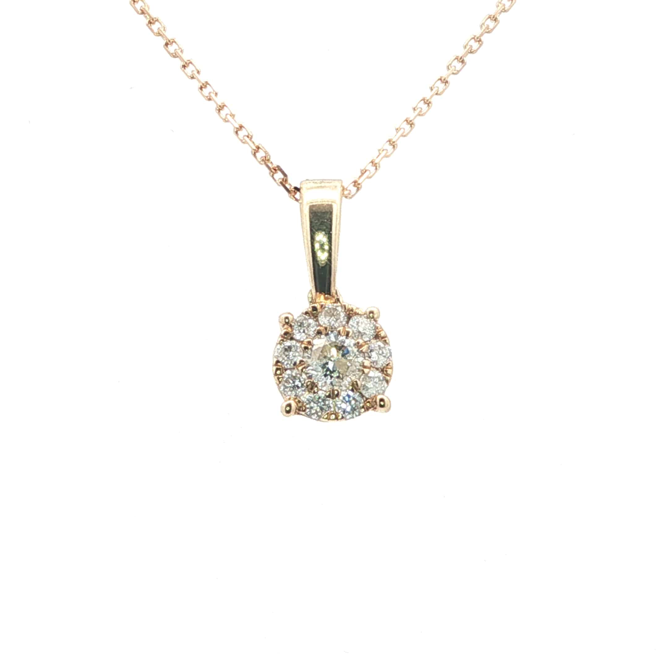 This refined 9ct yellow gold diamond pendant showcases a sparkling 0.20ct cluster of brilliant cut natural diamonds, arranged to create the look of a larger single stone. The classic round cluster design offers impressive brilliance and a timeless elegance that complements both everyday wear and more formal occasions.