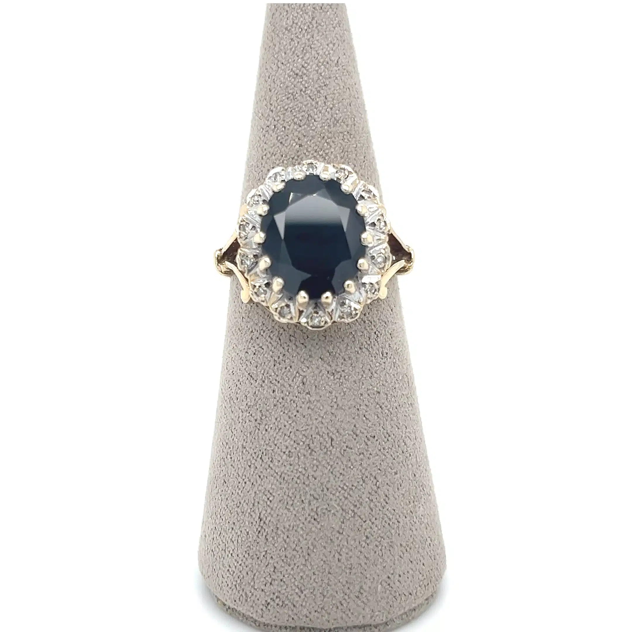 Make a classic statement with this elegant pre-owned sapphire and diamond cluster ring, crafted in 9ct yellow and white gold. At its centre sits an oval sapphire assessed at 4.91ct, chosen for its rich, inky-blue presence and bold, timeless appeal. A sparkling surround of 14 round diamonds (assessed total 0.07ct) frames the sapphire, adding refined brilliance and beautifully emphasising the centre stone.