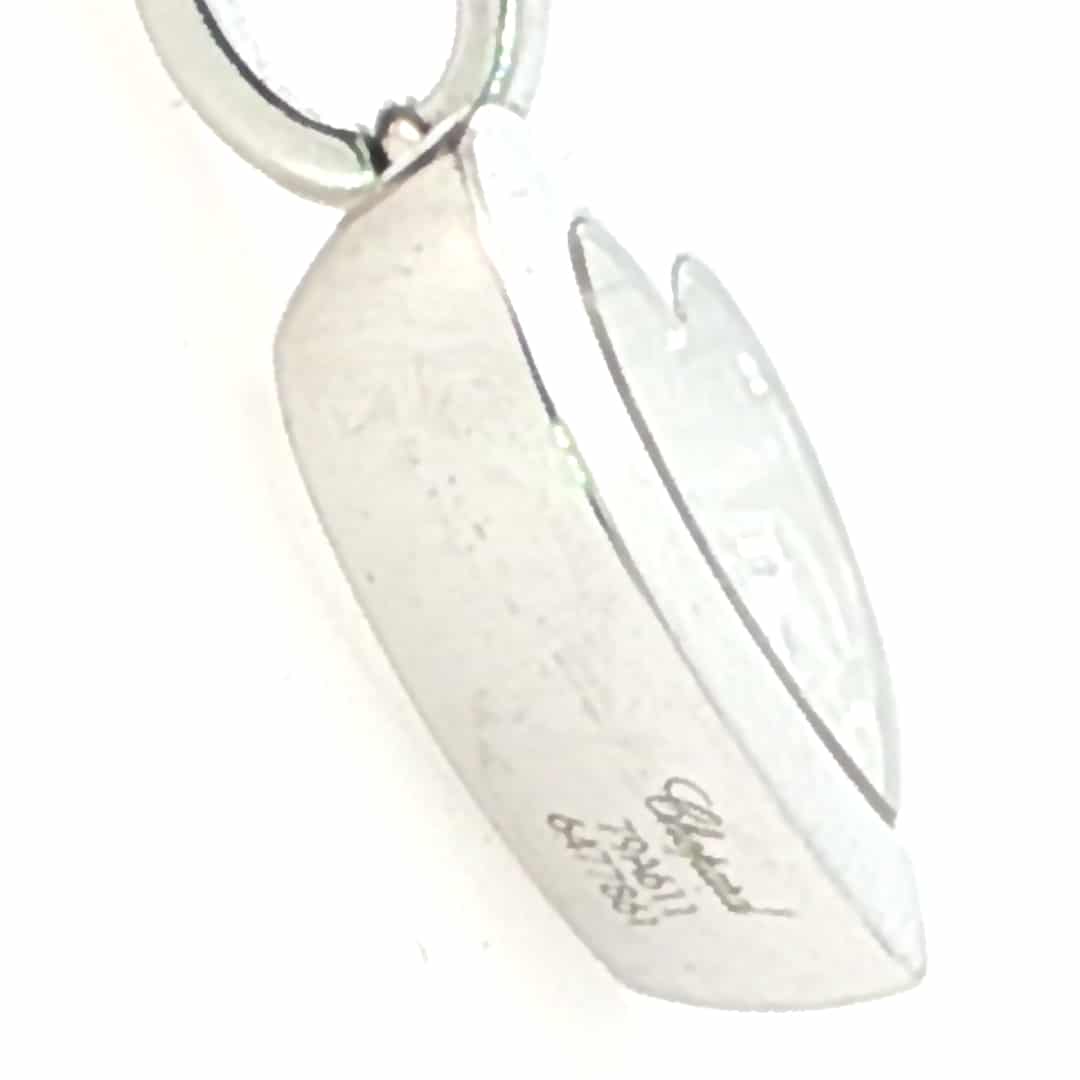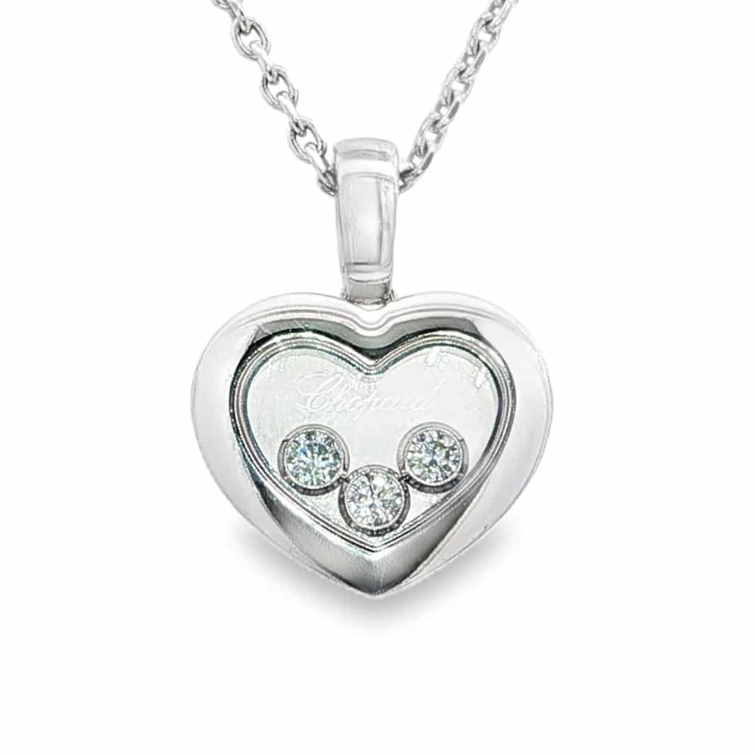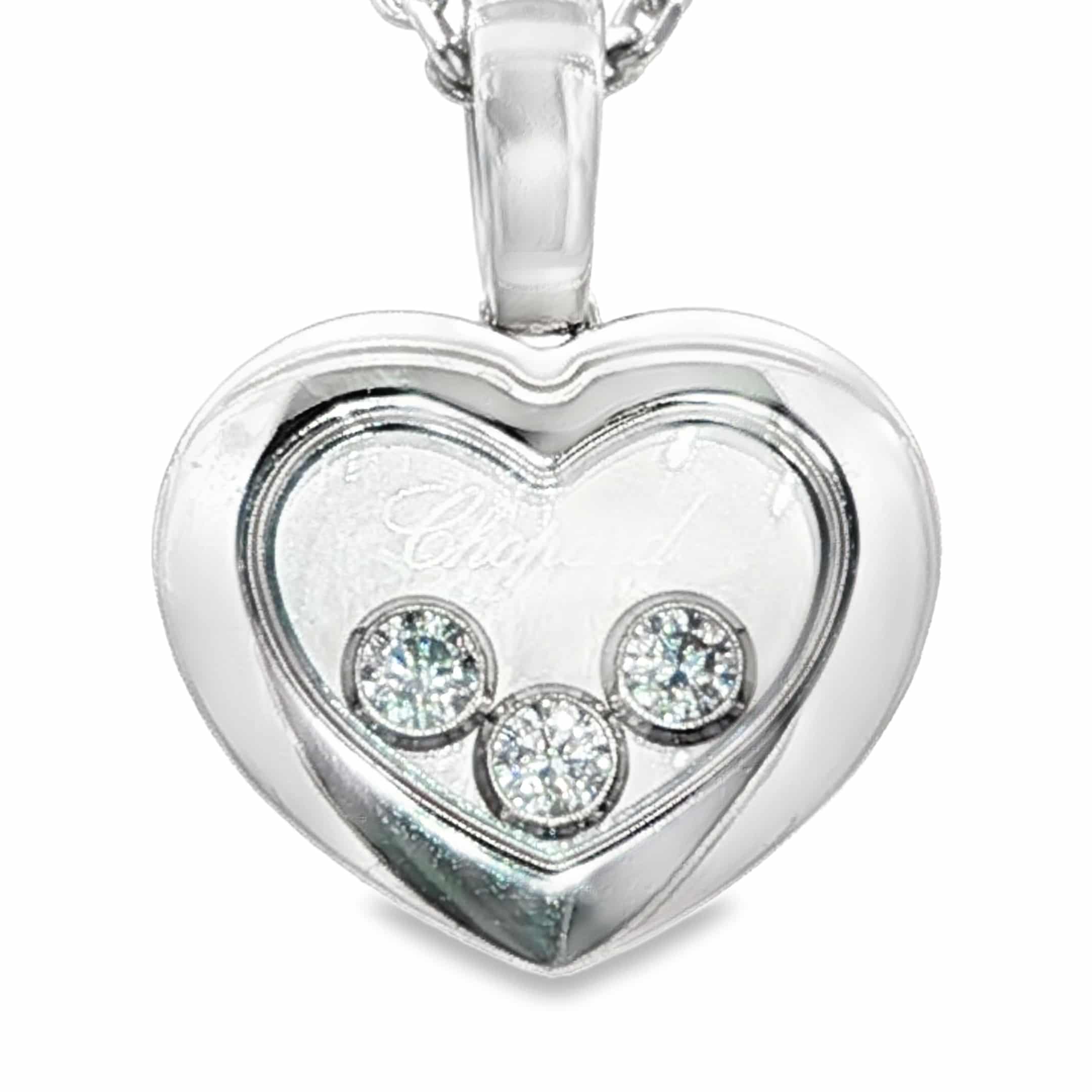 This elegant Chopard Happy Diamonds heart pendant is crafted in polished white gold and set with three sparkling round brilliant cut diamonds, free-set within the iconic floating heart design. A signature Chopard piece, combining playful movement with refined luxury, finished with original Chopard hallmarks.