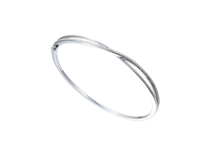 This crossover style incorporates a thin band of sterling silver interweaved with a thin band of glittering Cubic Zirconia, offering a contemporary look that will always be in style. This bangle is 1.75mm at the bottom and 4.2mm wide at the top and contains 60 Cubic Zirconia 1.7mm.