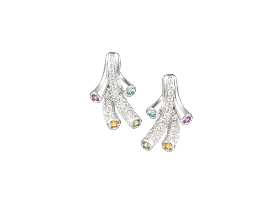 An inspired earring design with a magic mix of style and colour combining beautiful semi-precious Blue Topaz, Amethyst, Peridot and Citrine, overflowing with vibrant colour, with sparkling cubic zirconia. The infusion of colours and glittering cubic zirconia set in polished silver will add a touch of glamour and drama to any outfit, perfect for evening wear