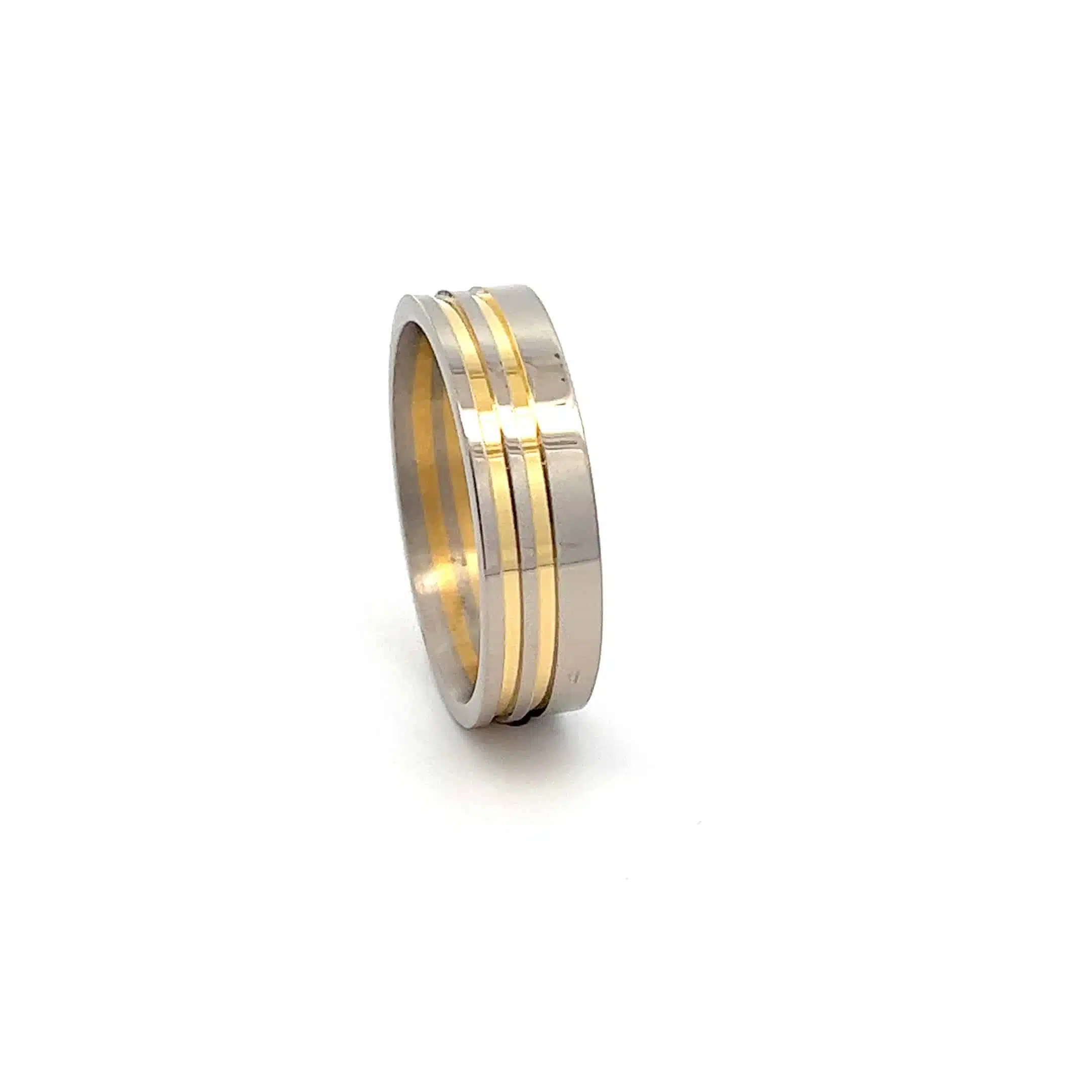 Handcrafted ; our flat top two tone ring with polished finish and two contrasting v-cut details, presented in a medium gauge.