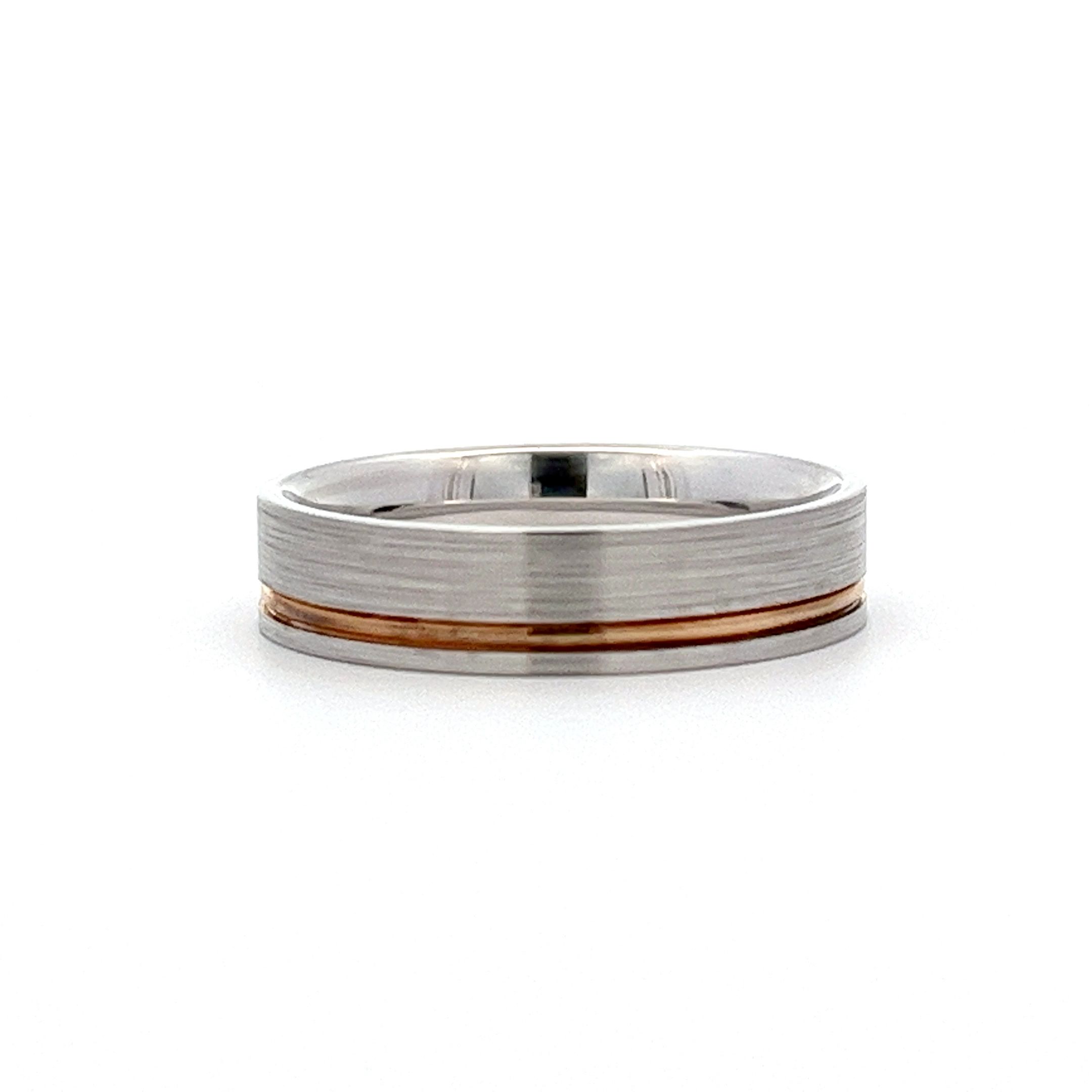 This classic flat topped wedding ring has been elevated with the inclusion of a polished solid metal groove running around the brushed ring in an offset position. Personalise this ring design with your own choice of precious metal combinations and finishes.