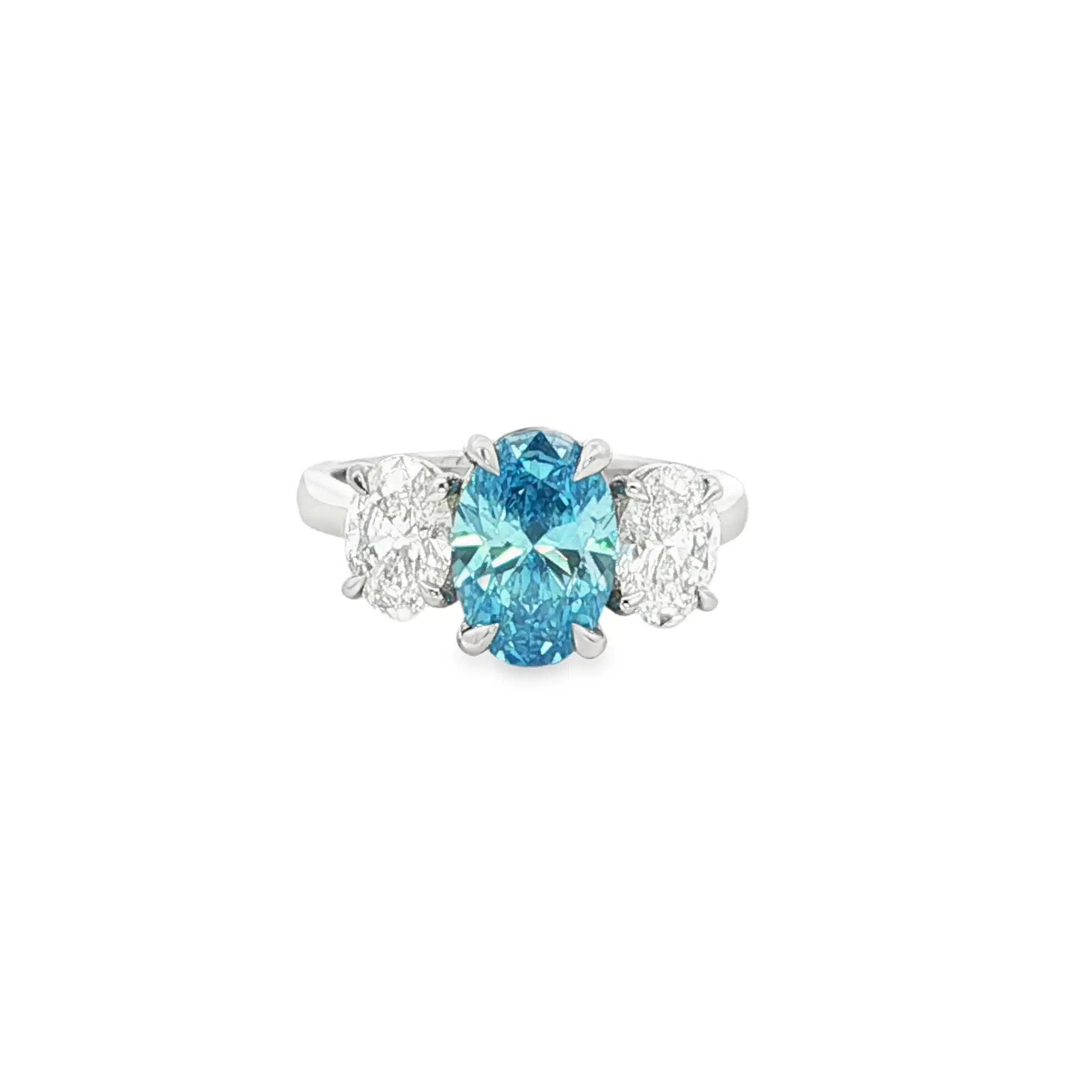 Oval Cut Lab Grown Blue Diamond and White Diamond Three Stone Ring