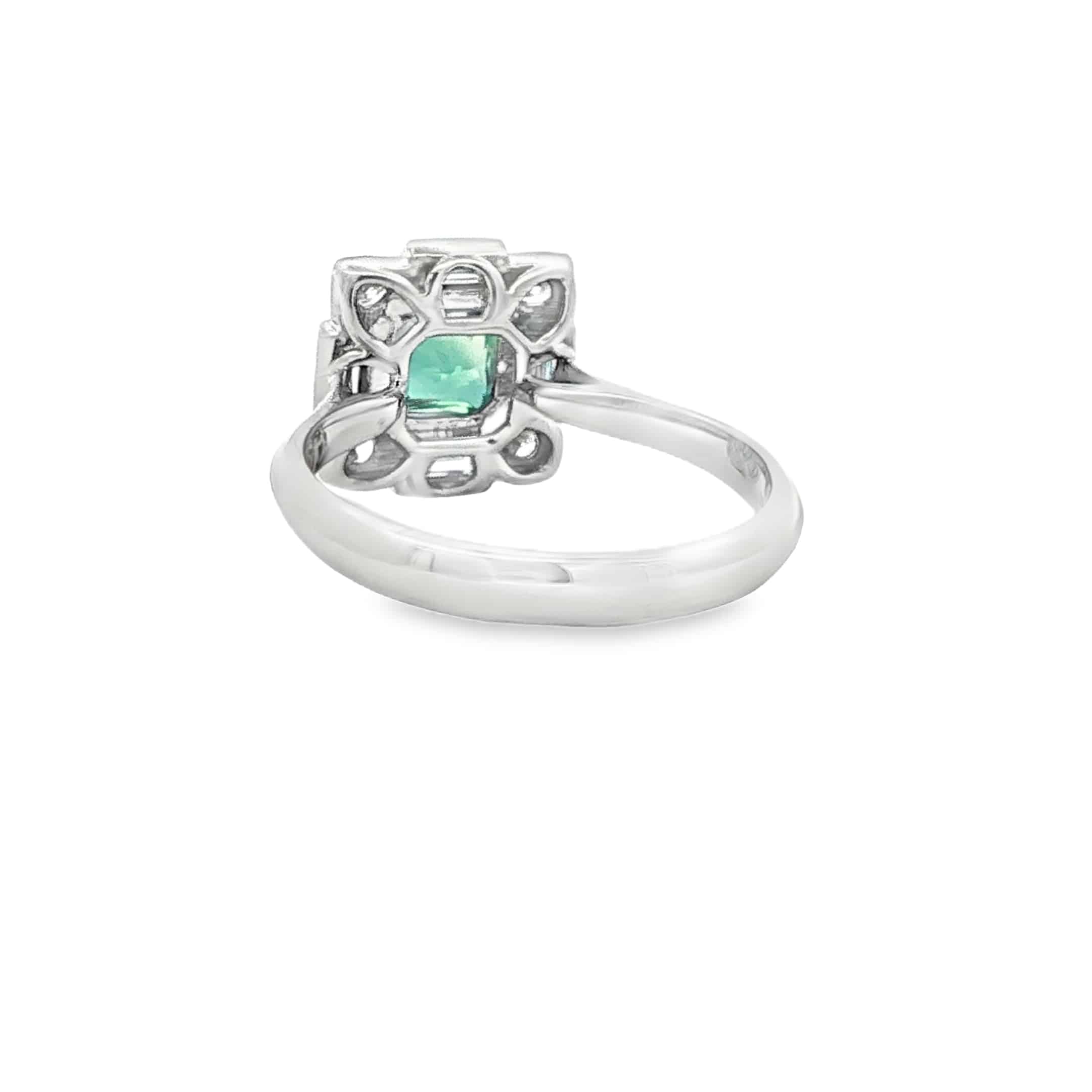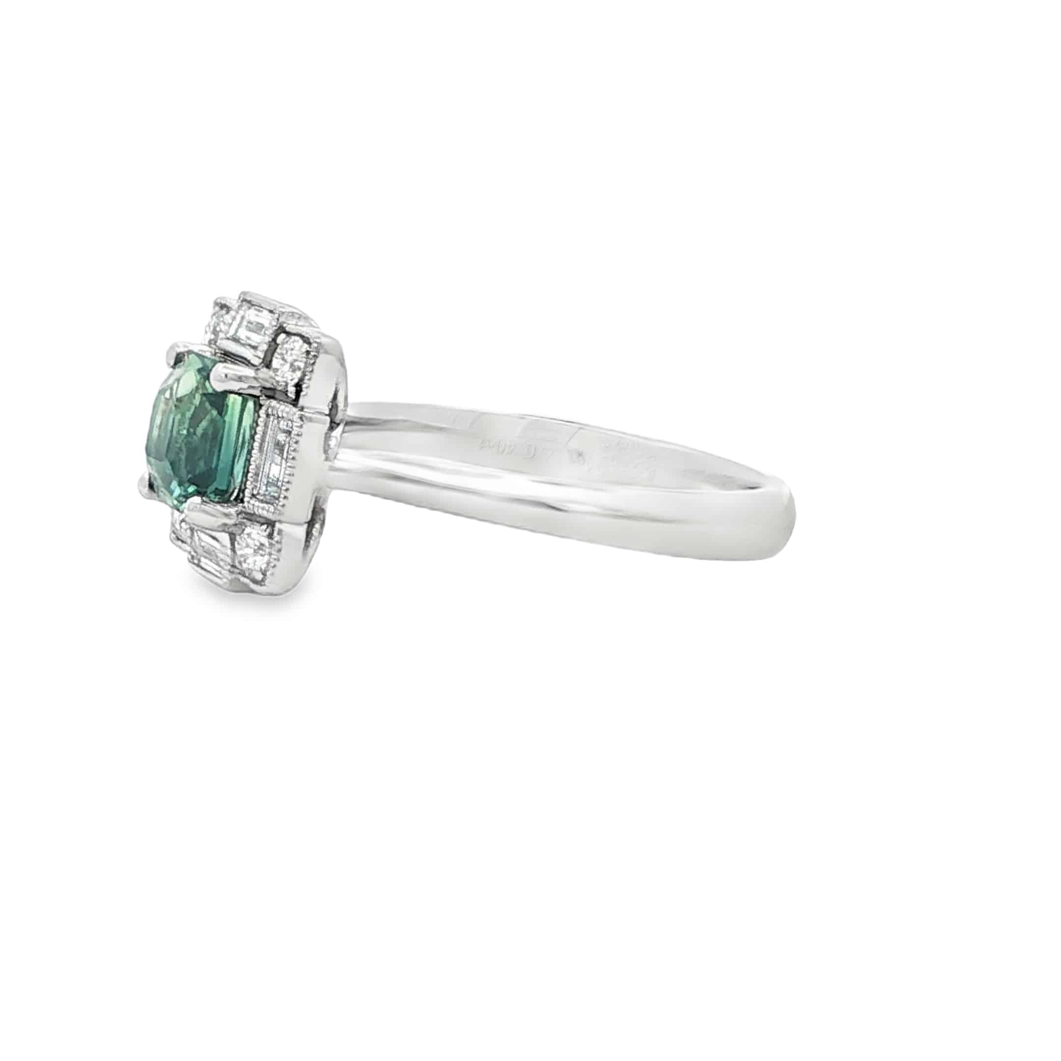 This platinum cluster ring centres a vivid 1.24ct teal sapphire, framed by 0.40ct of baguette and brilliant cut diamonds in a crisp Art Deco–inspired design. The clean lines and geometric detailing highlight the sapphire’s rich colour, creating a ring that feels both modern and timeless. Finished in polished platinum and sized for comfortable everyday wear, it’s a standout piece for someone who loves colour and elegant vintage styling.