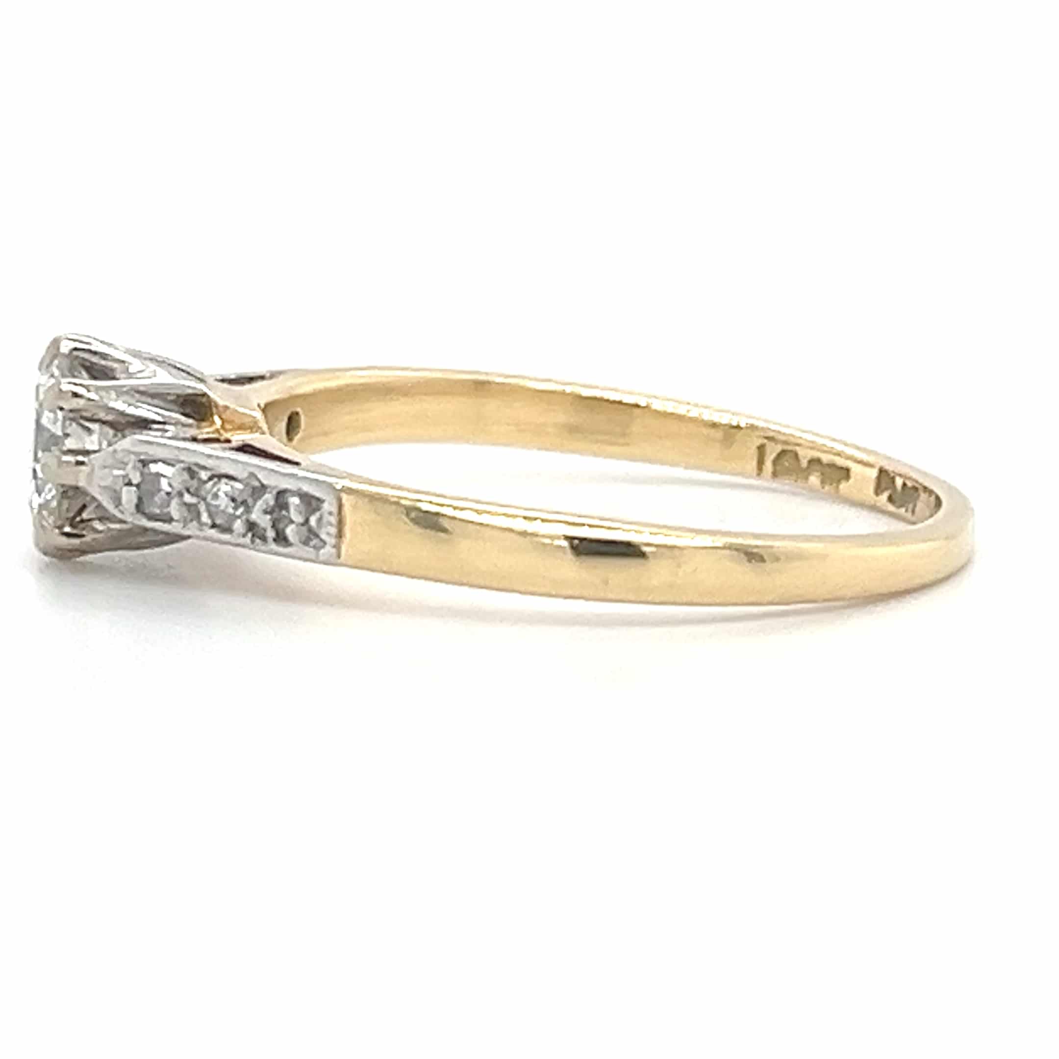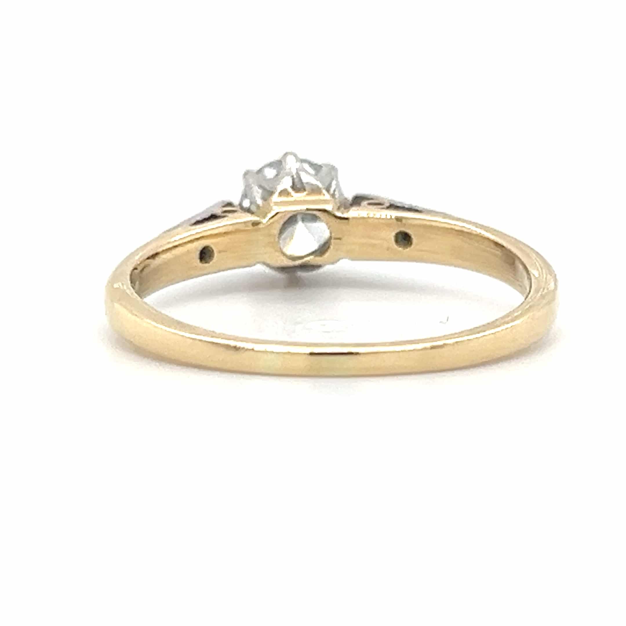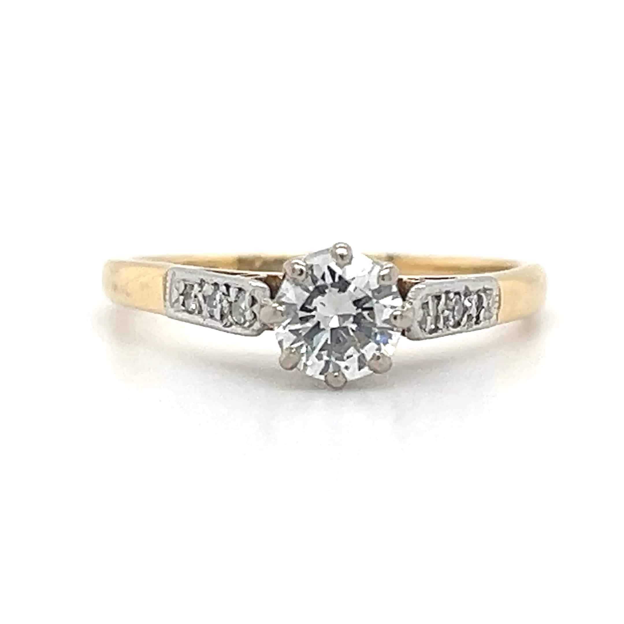 A classic pre-owned diamond solitaire ring crafted in platinum with an 18ct yellow gold shank, set with an approximately 0.40ct brilliant cut diamond. Elegant and timeless, this two-colour ring is ideal as an engagement or occasion piece and shows light wear consistent with age.