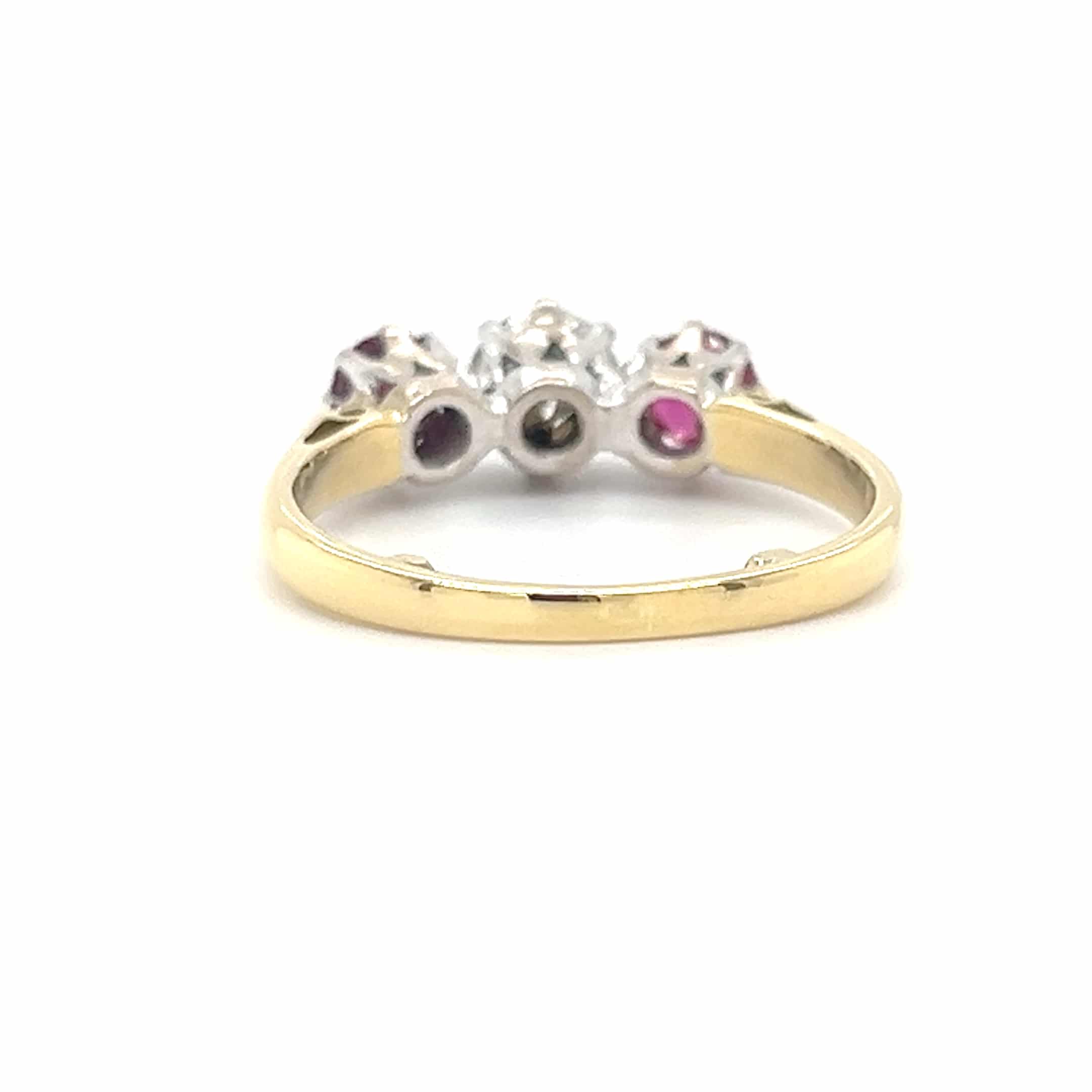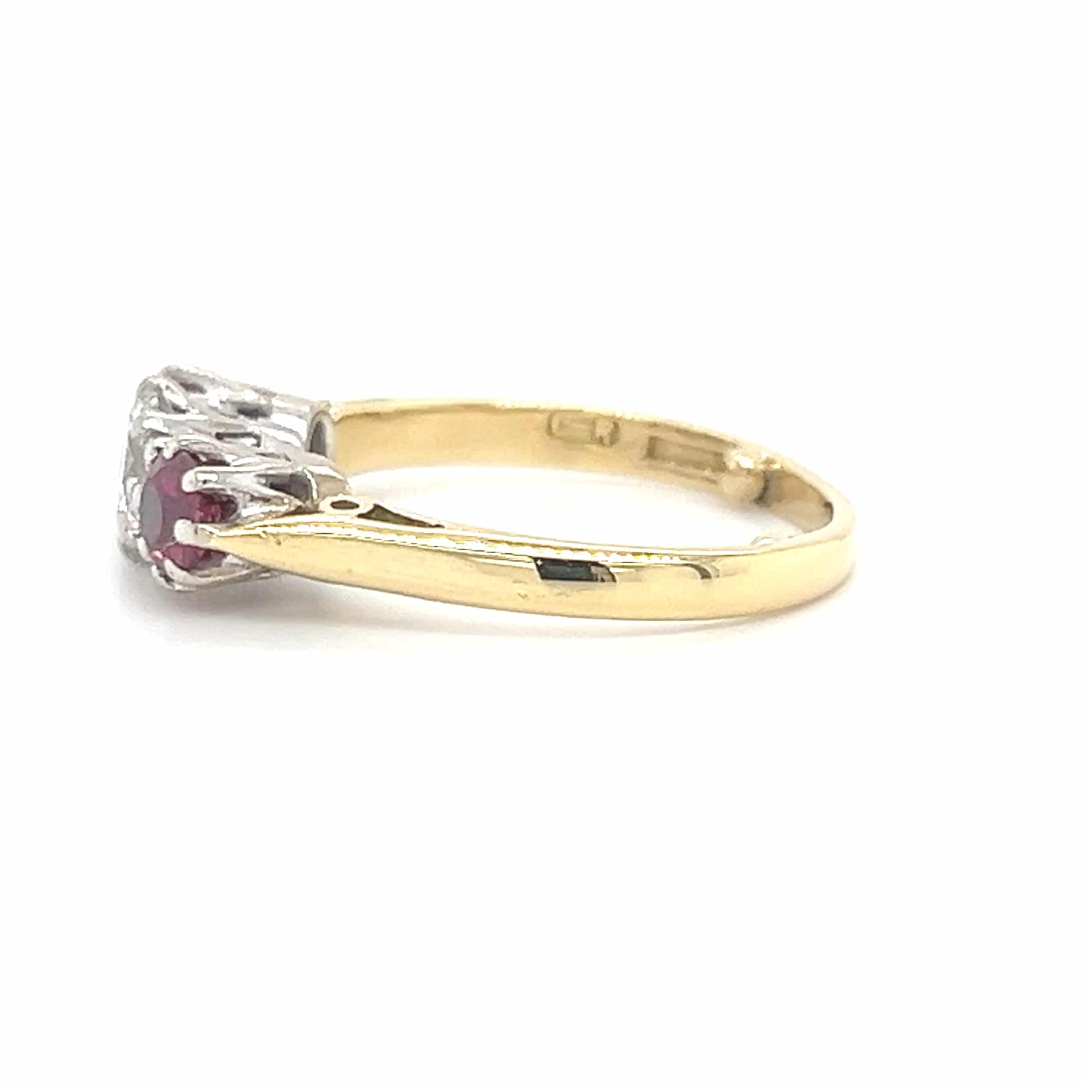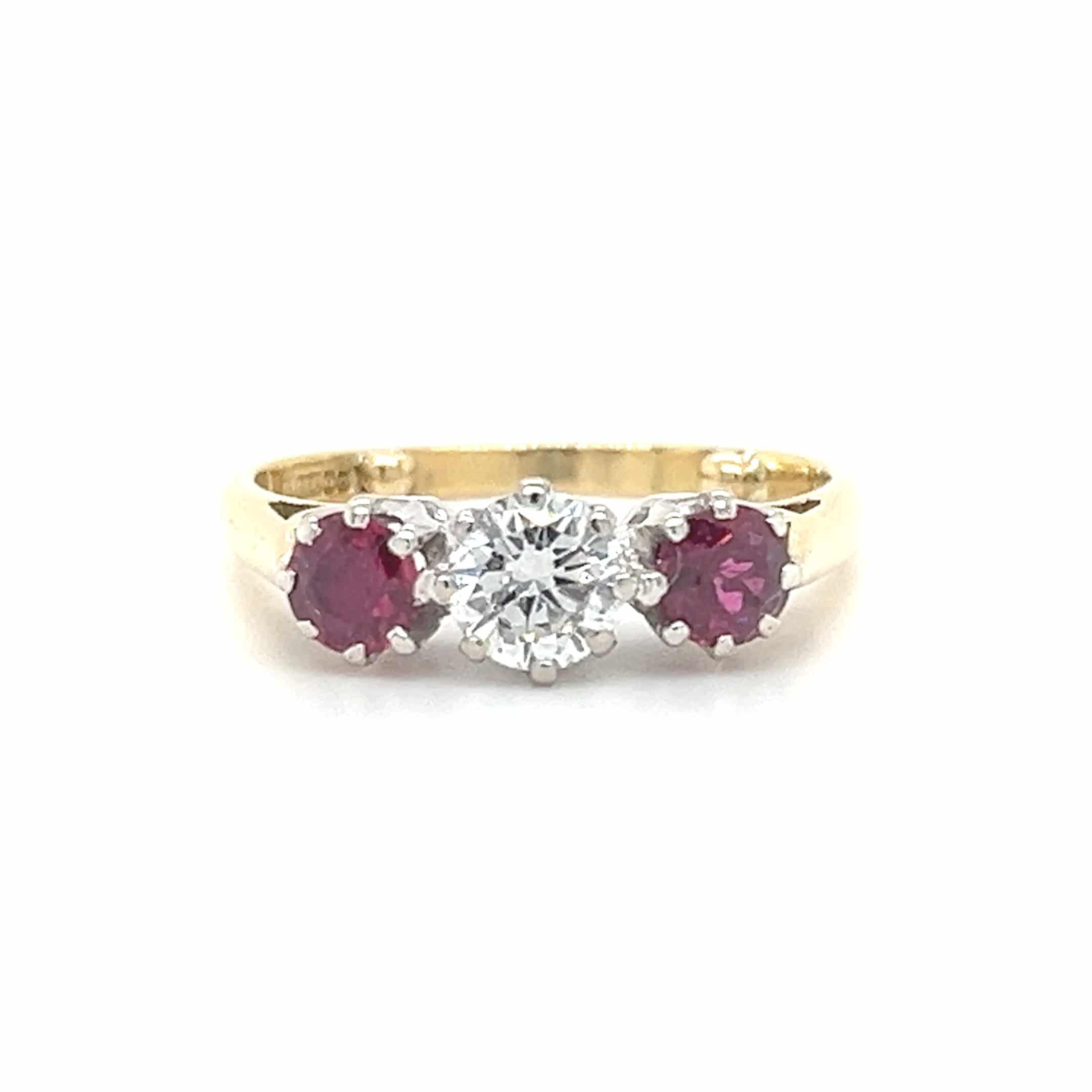This elegant pre-owned ruby and diamond three-stone ring is crafted in classic 18ct yellow gold, complemented by a contrasting white gold setting that beautifully enhances the gemstones. At the centre sits a brilliant cut diamond assessed at approximately 0.45ct, offering excellent sparkle and presence. It is flanked by two round rubies, each approximately 0.25ct, adding rich colour and timeless appeal to the design.