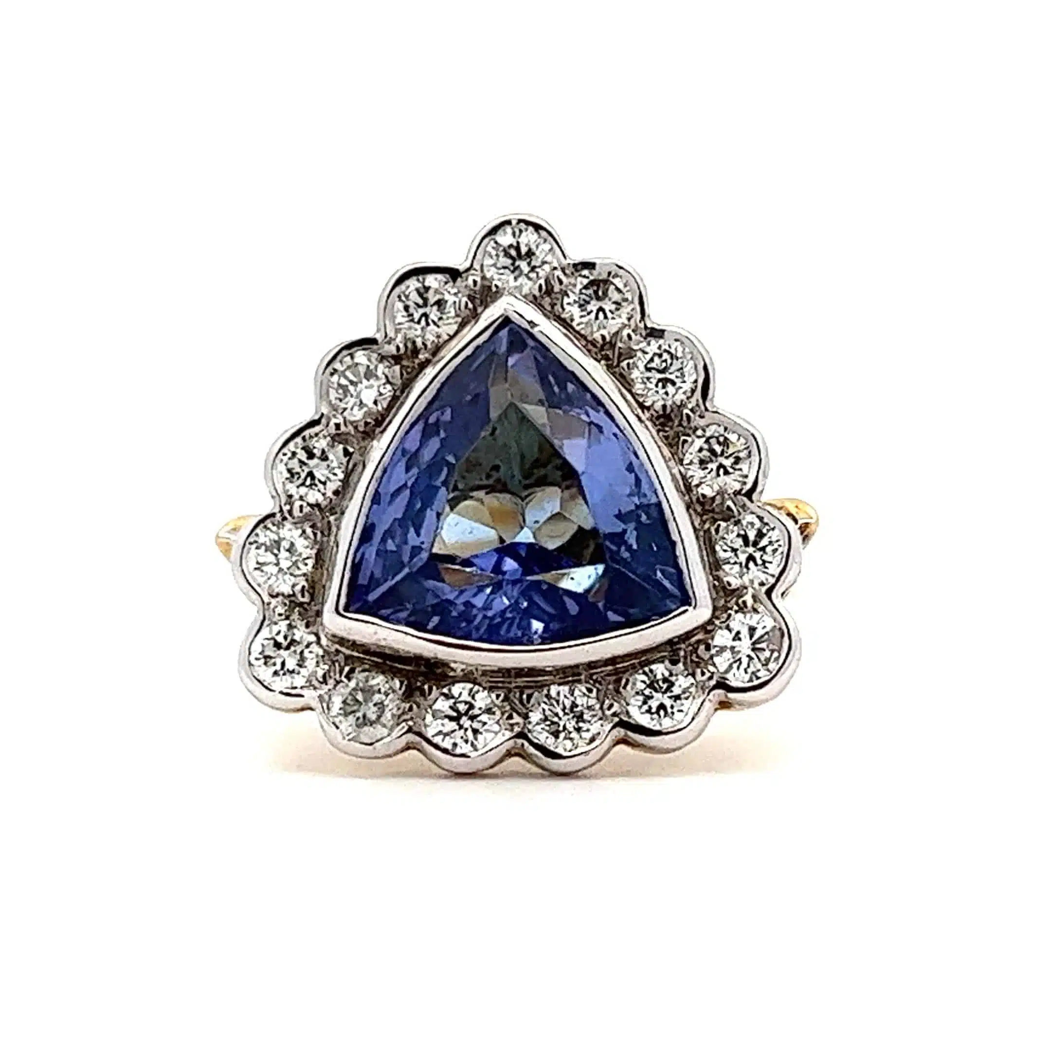 Step into a world of exquisite elegance with our preowned dress ring, showcasing a mesmerizing 5.50ct trilliant cut Tanzanite.