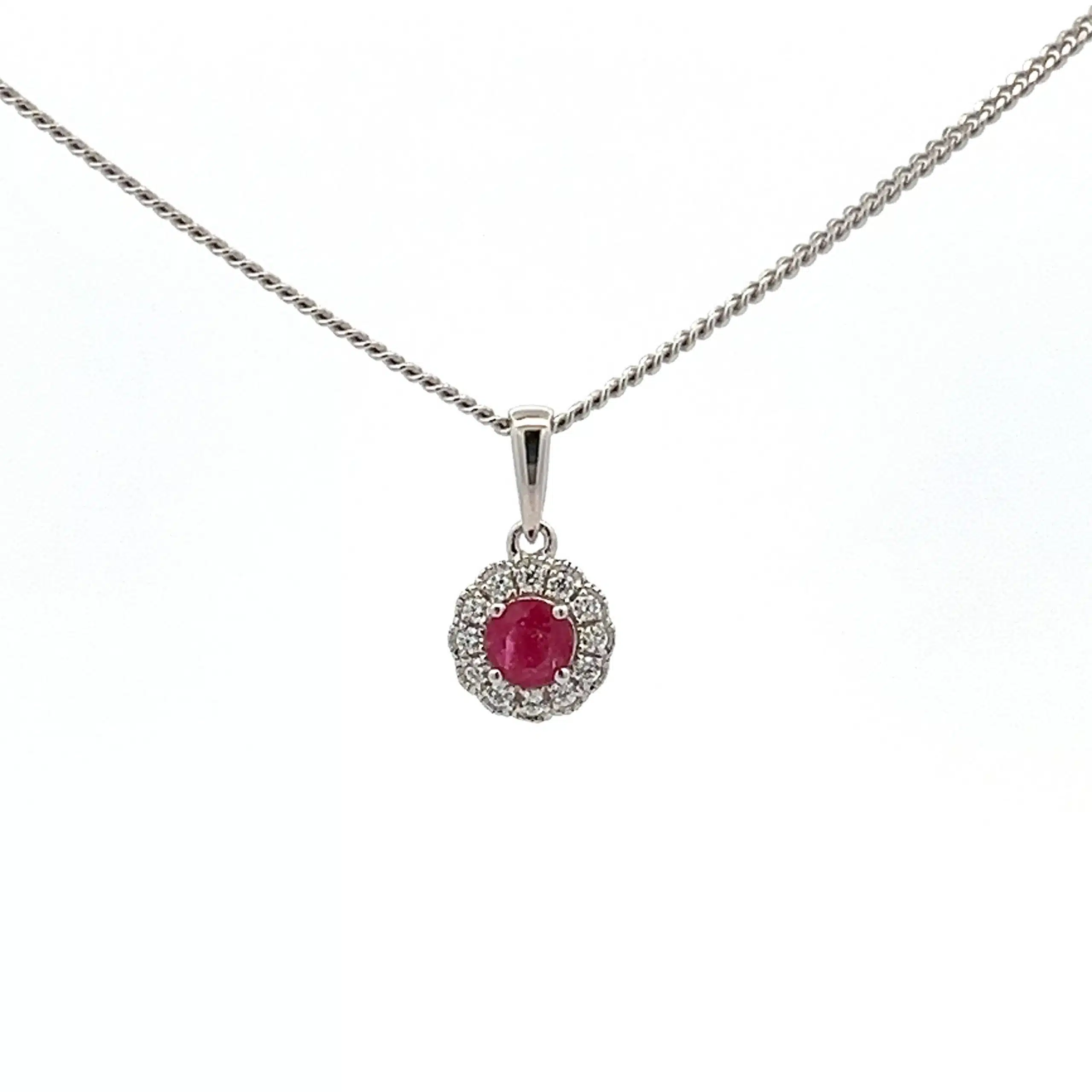 This is a vintage inspired cluster combining a rich red Ruby with surrounding smaller CZs, with a 16″ to 18″ adjustable silver chain.