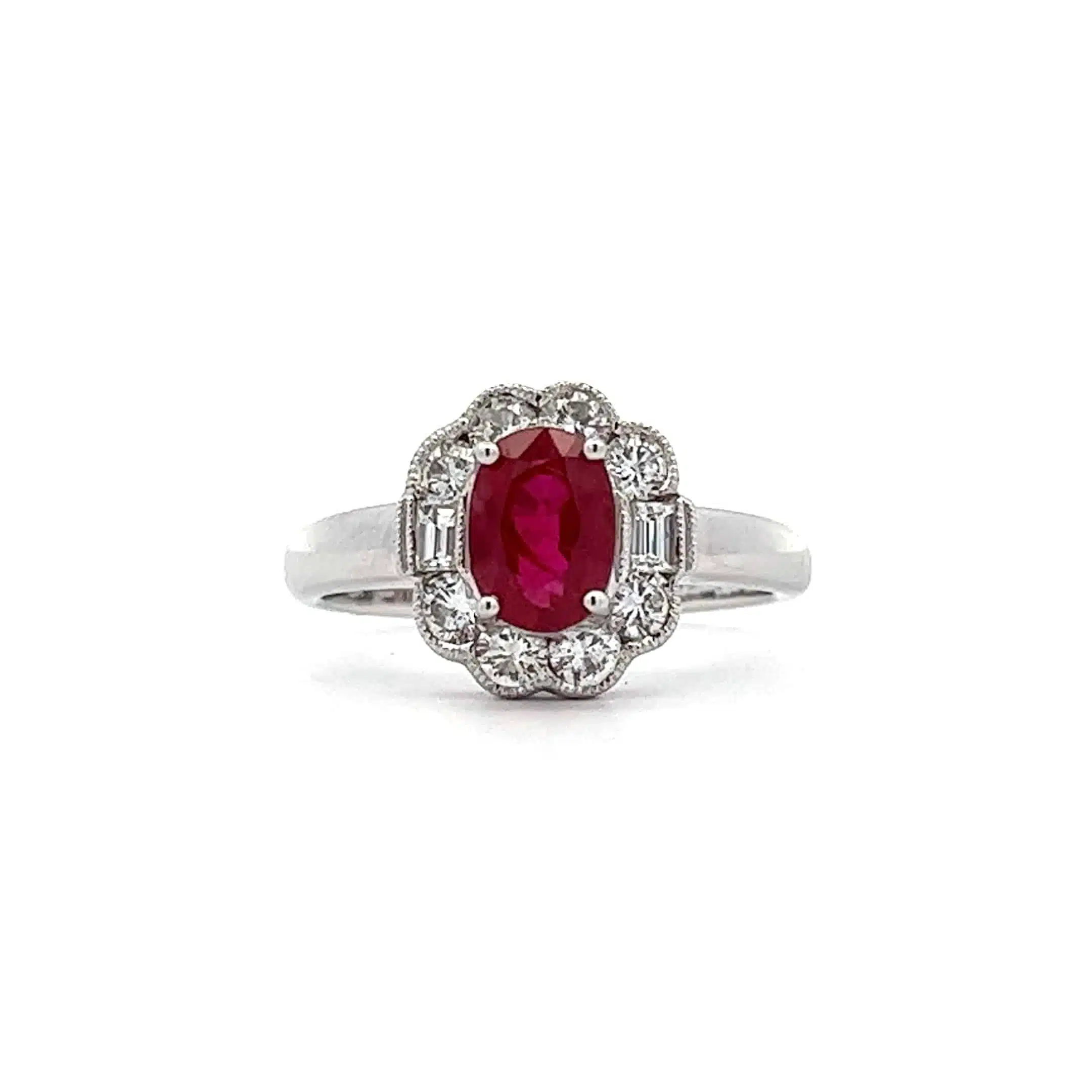 Featuring a striking 1.40ct oval-cut ruby at its centre, the deep red hue is beautifully enhanced by a sparkling 0.65ct diamond surround.