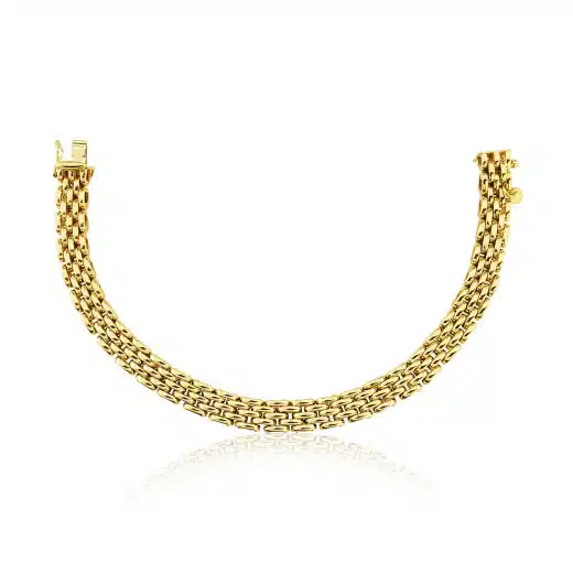 A Yellow Gold bracelet made with a ‘Panther’ link chain: rows of sideways links are joined together and laid on top of one another. The rows and columns of links in this style resemble brickwork due to its ‘off-set’ formation making a more fixed piece of jewellery that sits firmly and closely to the wrist. A popular accessory for those who like to wear substantial, statement accessories.